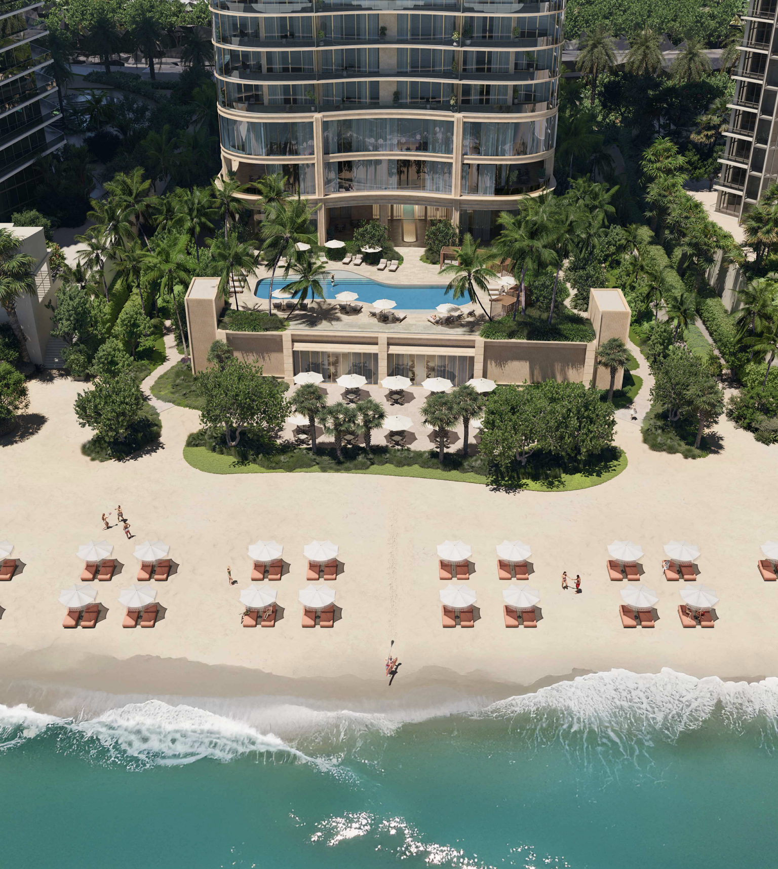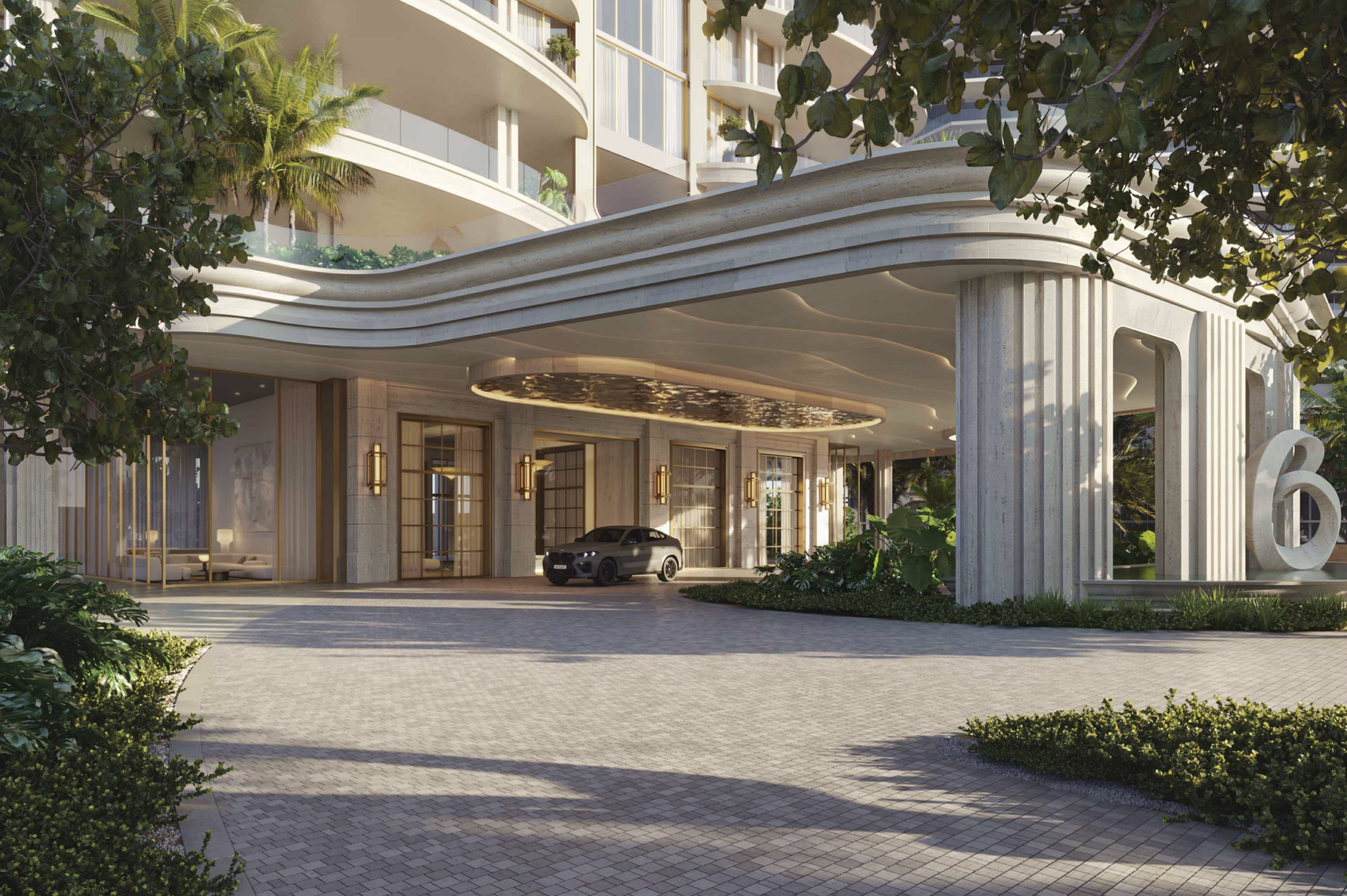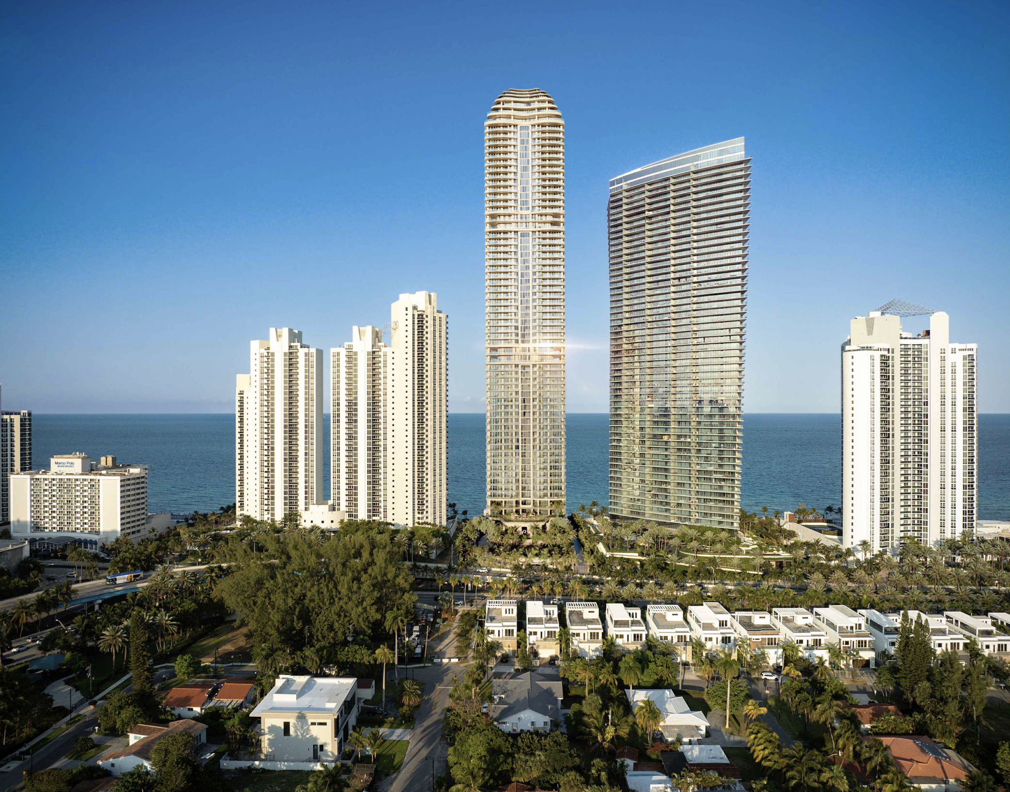 Landscape elements are intended to establish a continuous pedestrian environment across the site, with coordinated hardscape and planting strategies creating a park-like atmosphere. These landscaped connections extend from Collins Avenue on the west to the Atlantic Ocean on the east, reinforcing visual and physical continuity across the property.