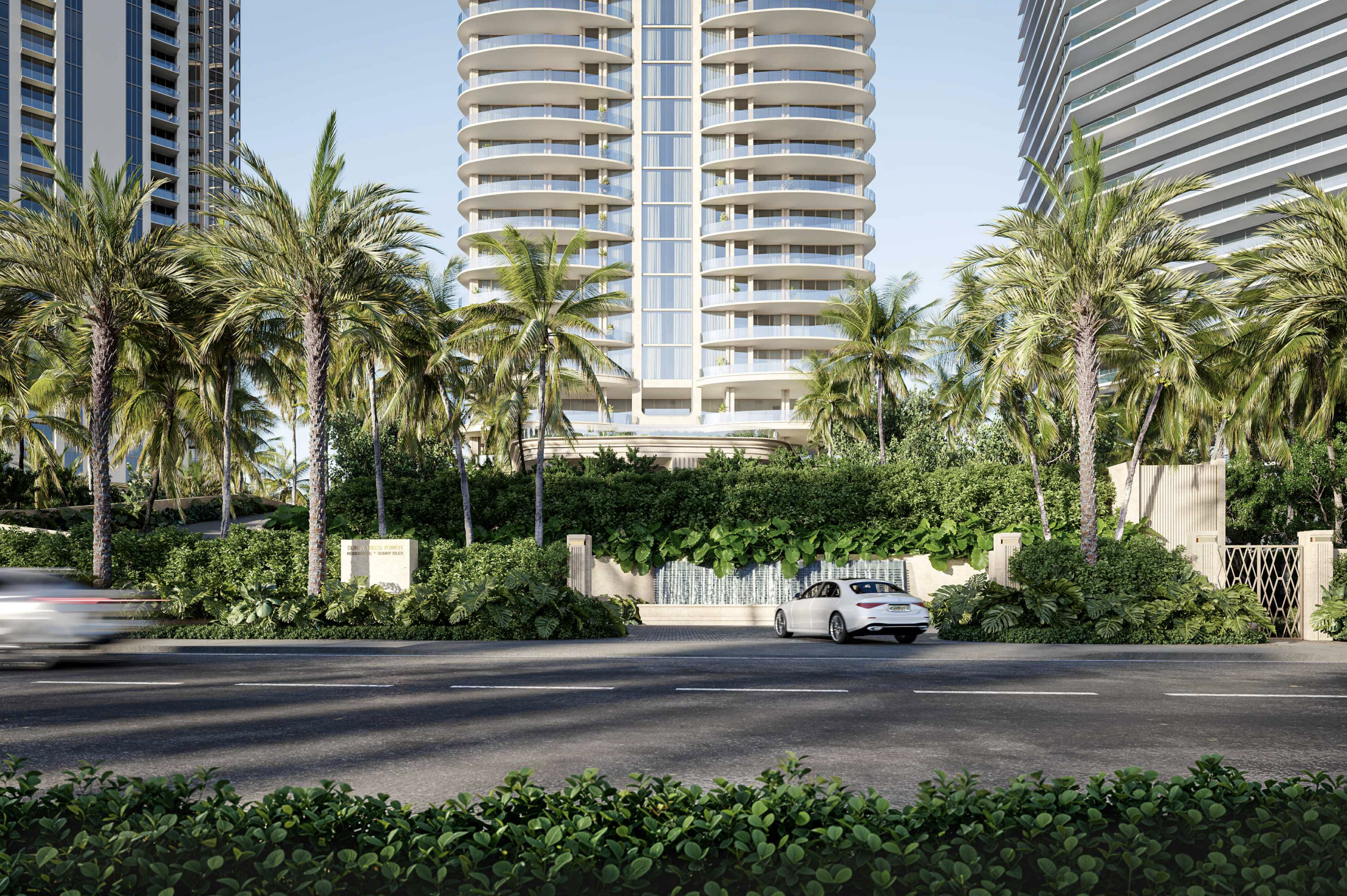 The tower would rise from a three-story podium containing 298 parking spaces arranged in a mix of tandem and standard configurations. The parking supply is designed to serve both the residential component and a proposed 2,390-square-foot private restaurant located within the building. An elevated driveway is planned to carry vehicles to the main lobby level at the top of the podium, a circulation approach commonly used in high-rise developments along Collins Avenue.