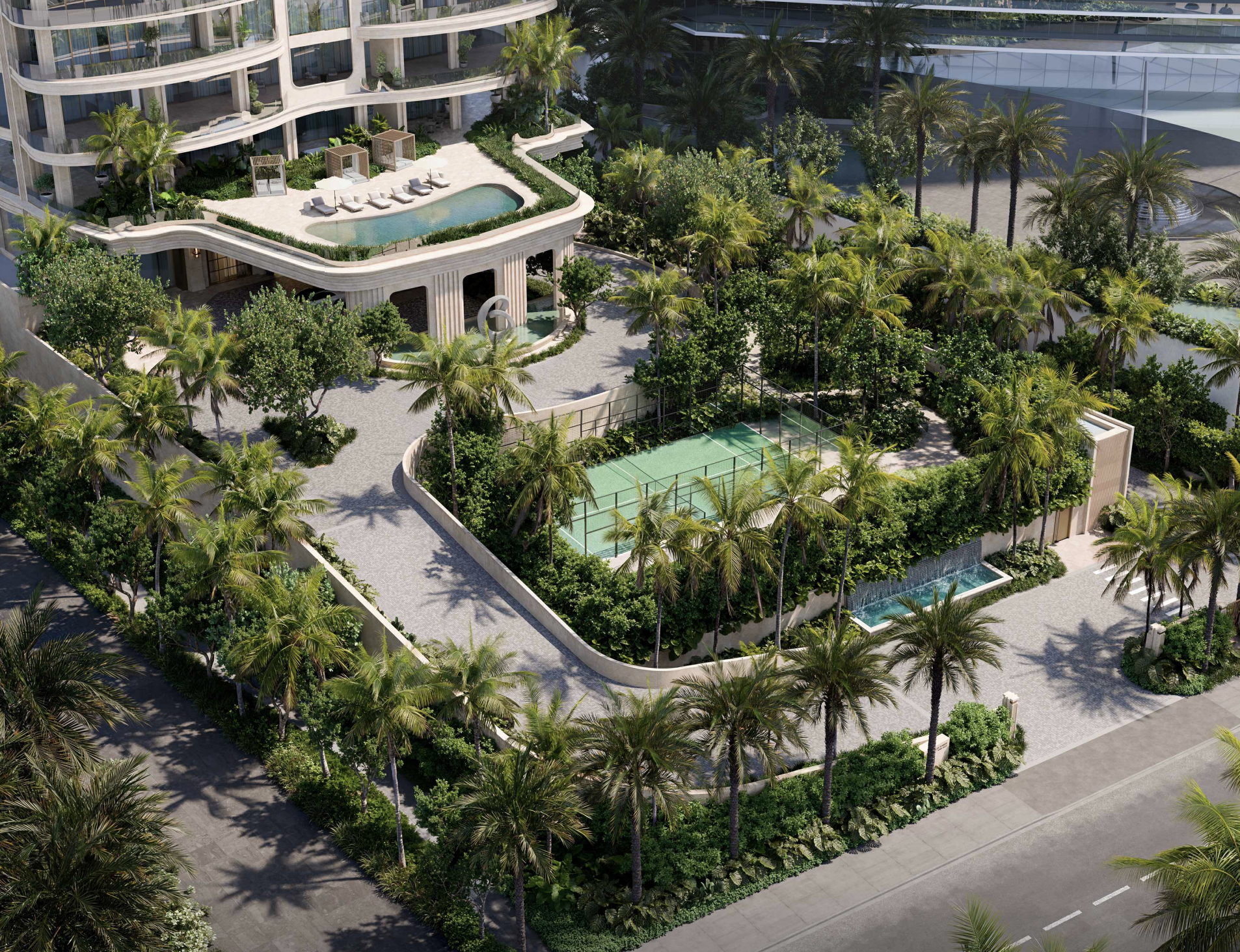 The design organizes amenities along both the west and east sides of the property. On the west side, facing Collins Avenue, plans include a series of sunset-oriented amenities, including a padel ball court, integrated water features, a sculpture garden, and a raised pool deck. On the east side facing the ocean, the project incorporates sunrise-oriented amenities, including a large lap pool, outdoor spa facilities, cabanas, outdoor seating areas, and a landscaped lawn that transitions directly to beach access.