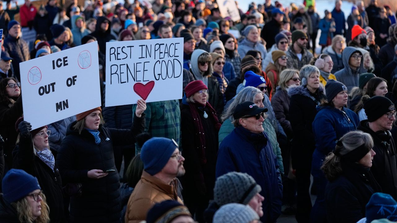 People gather for a vigil honoring Renee Good, who was murdered by an ICE officer in Minneapolis earlier in the week, at the Minnesota State Capitol in St. Paul, Friday, Jan. 9, 2026. [AP Photo/John Locher]