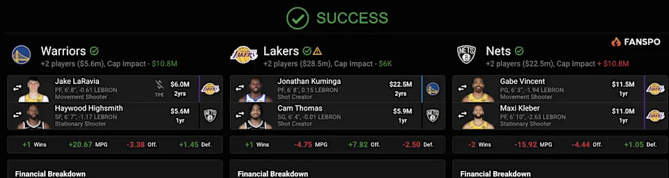 The Lakers reportedly have some interest in Kuminga, but it’s hard to come up with a deal that works straight up between the two teams due the arcane rules around the forward’s “base year compensation.” I wanted to get the Warriors Jake LaRavia in this deal, so I included the Nets as a third team, who could conceivably pick up multiple future second-round picks for taking on a pair of expiring contracts by make the numbers work. LaRavia hasn’t been great this year (41st percentile EPM), but he has a combination of size, shooting, and IQ on the wing that could entice Golden State. Highsmith is currently recovering from a torn meniscus, but he’s shown some level of competency as a two-way forward when he’s been healthy. The Lakers get a chance to give Kuminga a more defined role, and maybe they turn him in to a solid rotation piece the same way they’ve done with Rui Hachimura. I think this one makes sense for all sides.