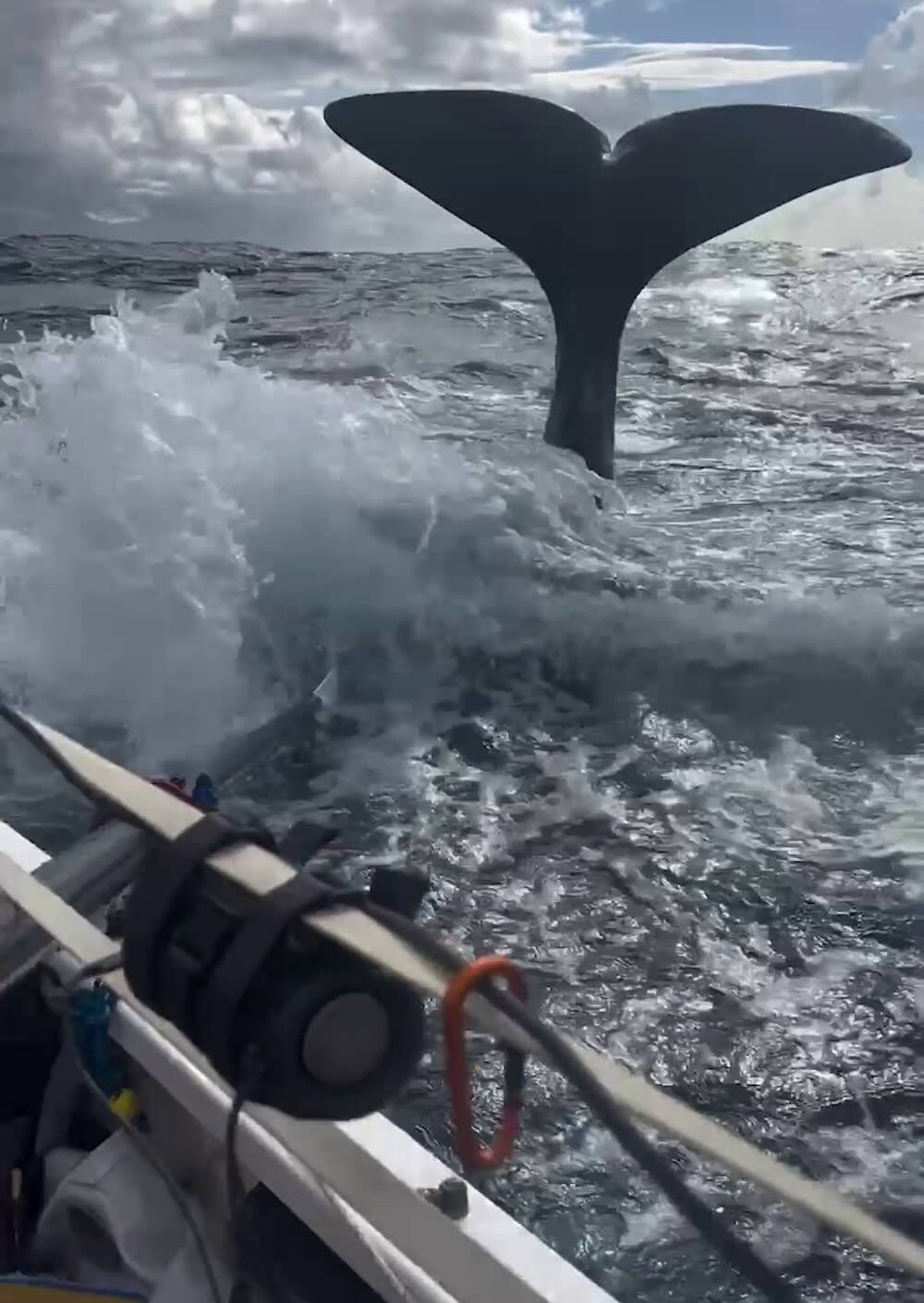 The video shows one of the mammals breaching right next to the side of their boat—and the ‘Get Busy Rowing’ team feared their vessel could be struck.