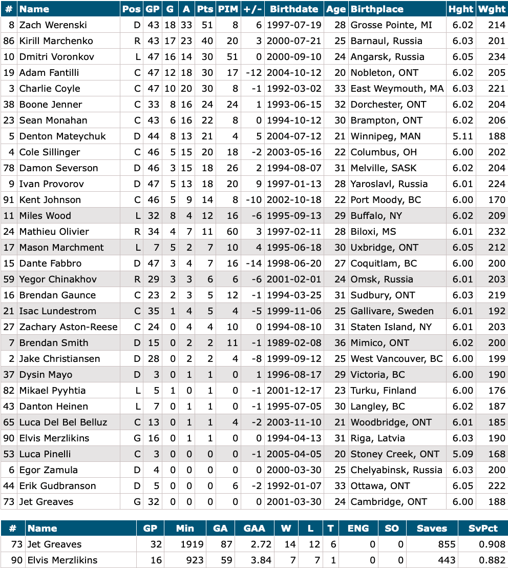 Goalies: Elvis Merzlikins, Jet Greaves