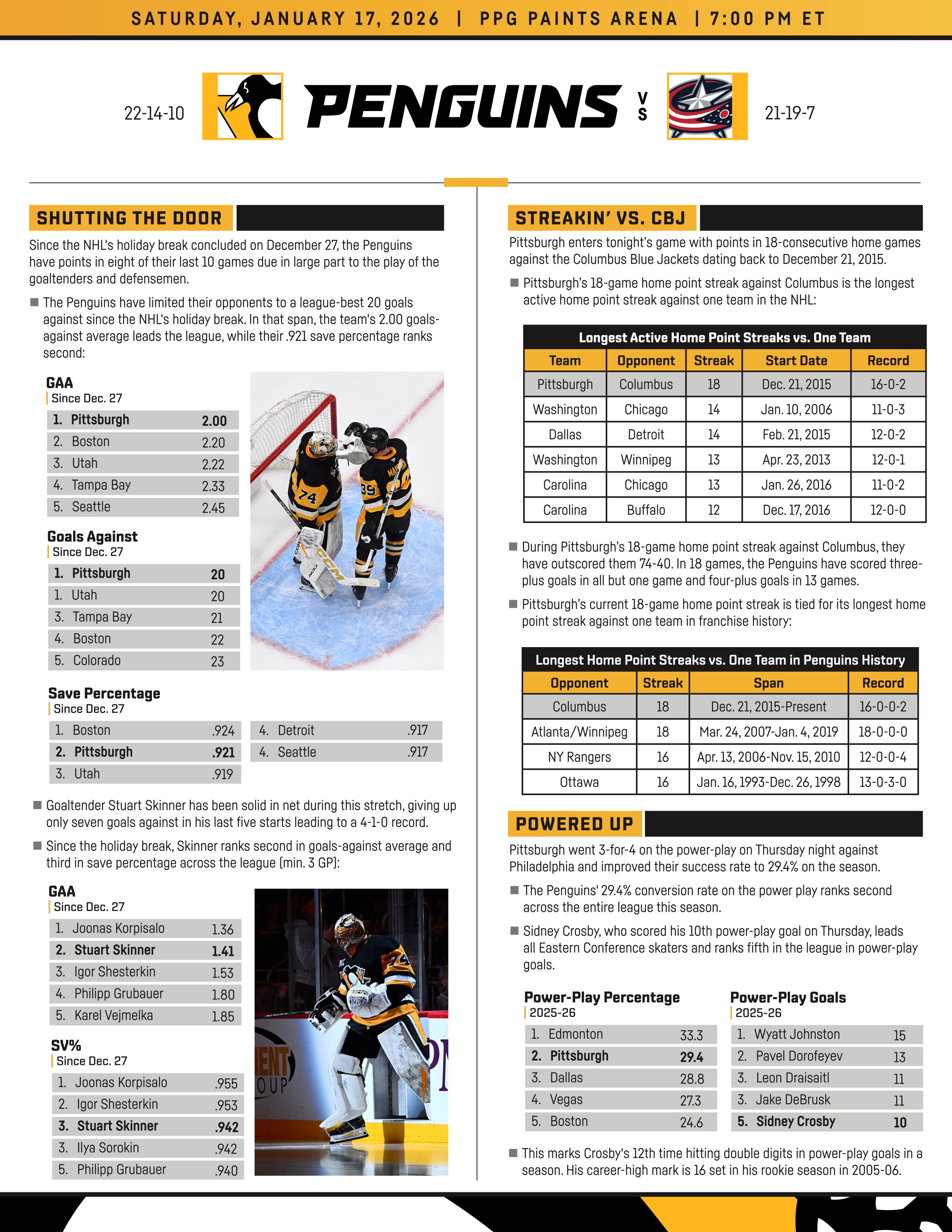 The Penguins had an off day Friday after Thursday’s 6-3 win over the Flyers.Sidney Crosby has 69 points (24 goals, 45 assists) in 48 career games against the Blue Jackets, which ranked behind only Patrick Kane for the most among any active NHL player. Kris Letang meanwhile leads all NHL defensemen with 14 goals against the Blue Jackets, his highest total against any single team, per Penguins PR.The Penguins are 14-1-4 in their last 19 games against the Blue Jackets, and they’re 16-0-2 in their last 18 games against the Jackets at home, per Penguins PR.The Pens’ special teams have been thriving lately. They’re heading into Saturday’s matchup having gone 16-for-16 on the PK over their last four games, and they’re currently ranked second in the NHL with a 29.4 percent power-play success rate.