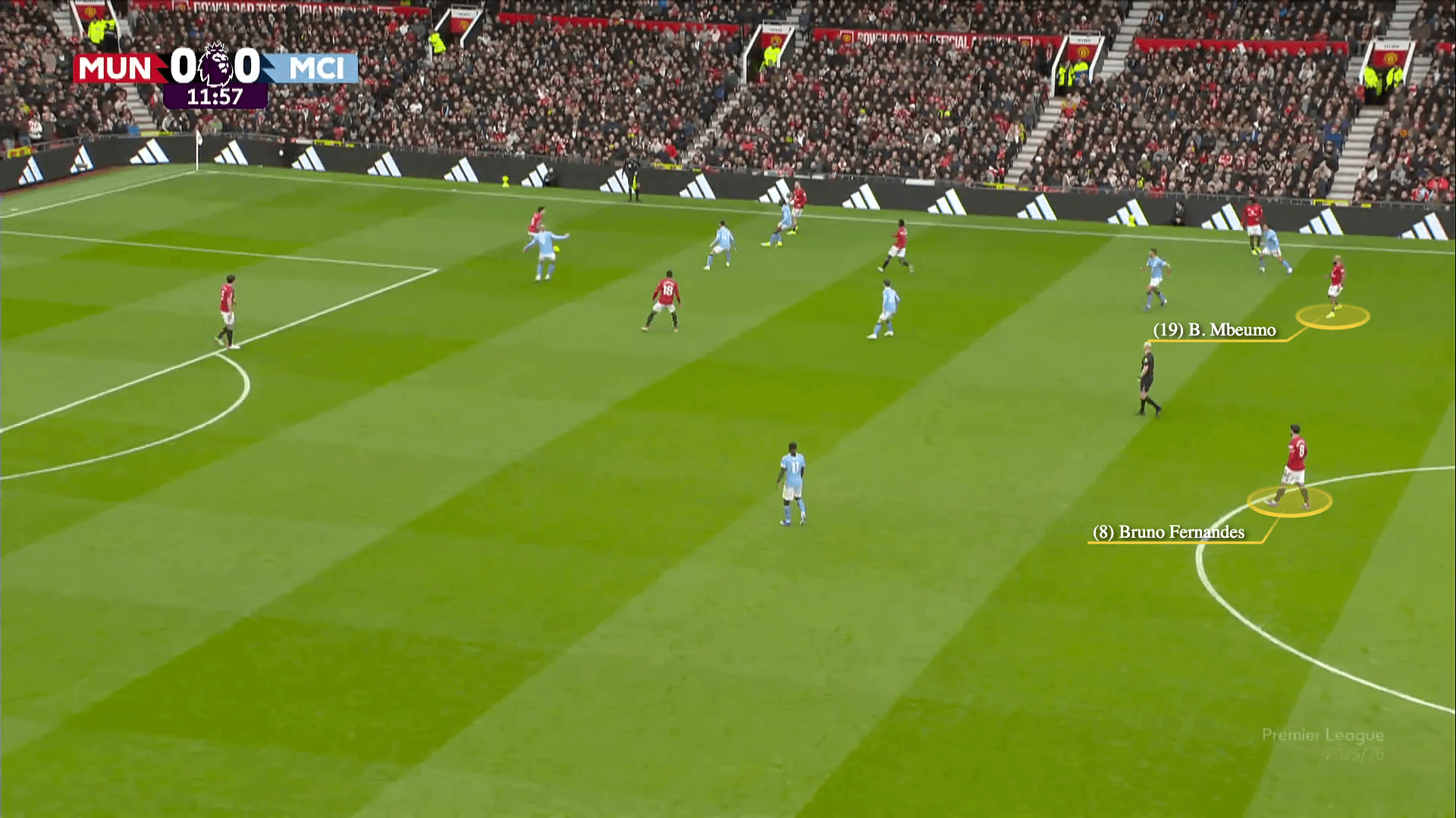 Below, Harry Maguire finds the dropping Mbeumo, with Rodri in a deeper position covering Max Alleyne, who is tracking Fernandes.