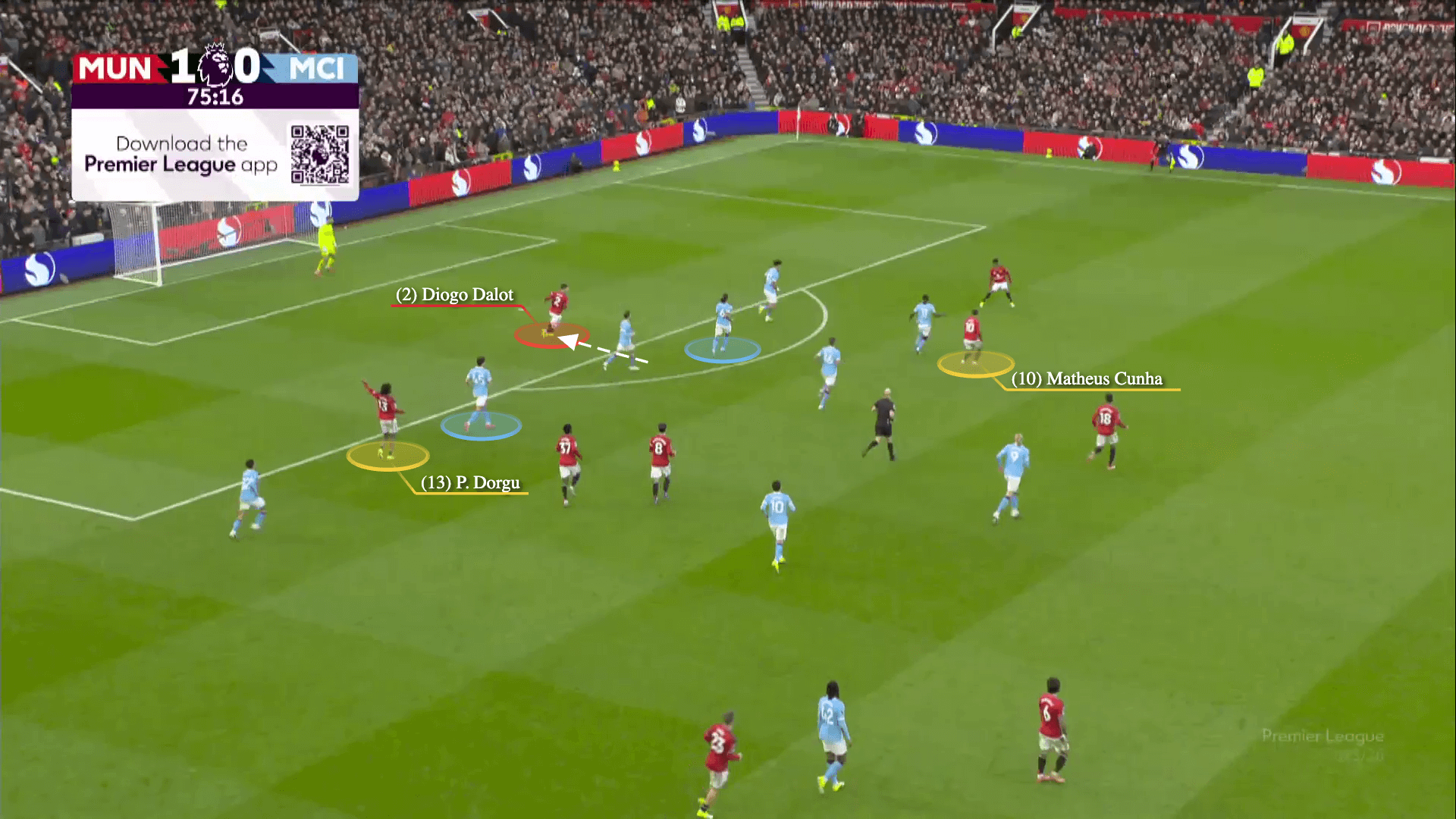 Meanwhile, Amad and Fernandes are overloading Ake, and the Portugal midfielder makes a run behind City’s pinned defensive line. Martinez finds Fernandes’ run into space, and the latter scores from this move, but the goal is disallowed for a close offside call.
