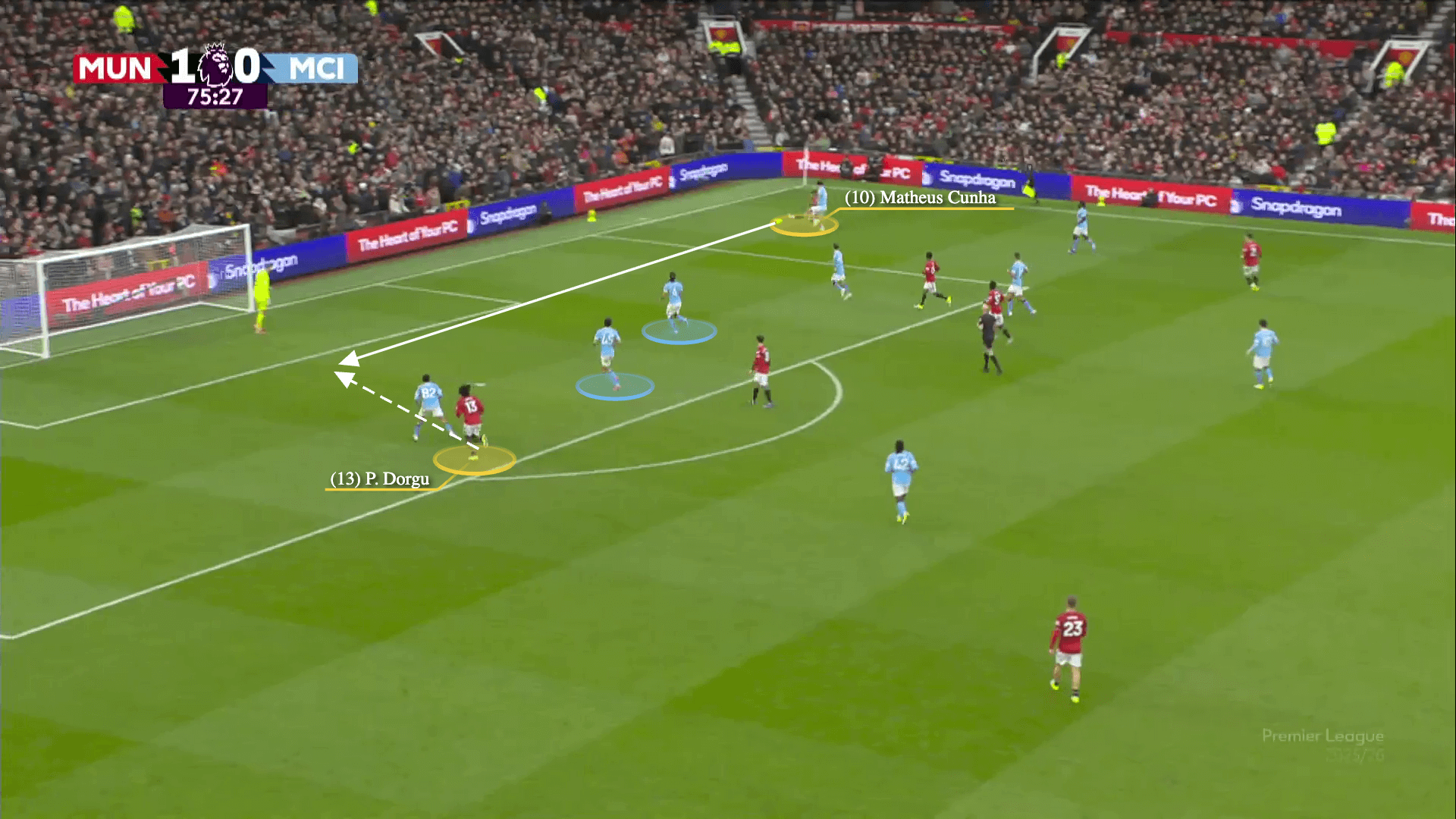 However, Dorgu moves inside to attack the space behind City’s centre-backs when Cunha is in a crossing position…