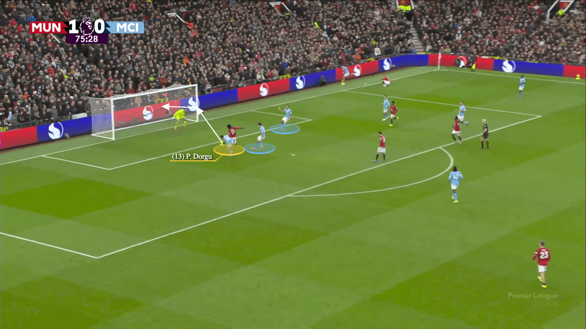 While Fernandes manipulates Rodri’s position and prevents him from dropping to support the defensive line, Dorgu and Mbeumo occupy the left side of City’s defence.