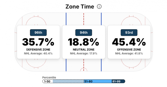 When you play the bulk of your time in the offensive zone, good things happen. Around the league, Clarke ranks in the 93rd percentile or better in terms of time spent in both the offensive and defensive zones. Per NHL Edge metrics, he’s well above average in terms of how frequently he’s playing inside the offensive blueline and well below average in terms of how frequently he’s inside his own end.