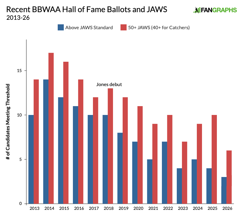The following article is part of Jay Jaffe’s ongoing look at the candidates on the BBWAA 2026 Hall of Fame ballot. For a detailed introduction to this year’s ballot, and other candidates in the series, use the tool above; an introduction to JAWS can be found here. For a tentative schedule, see here. All WAR figures refer to the Baseball Reference version unless otherwise indicated.