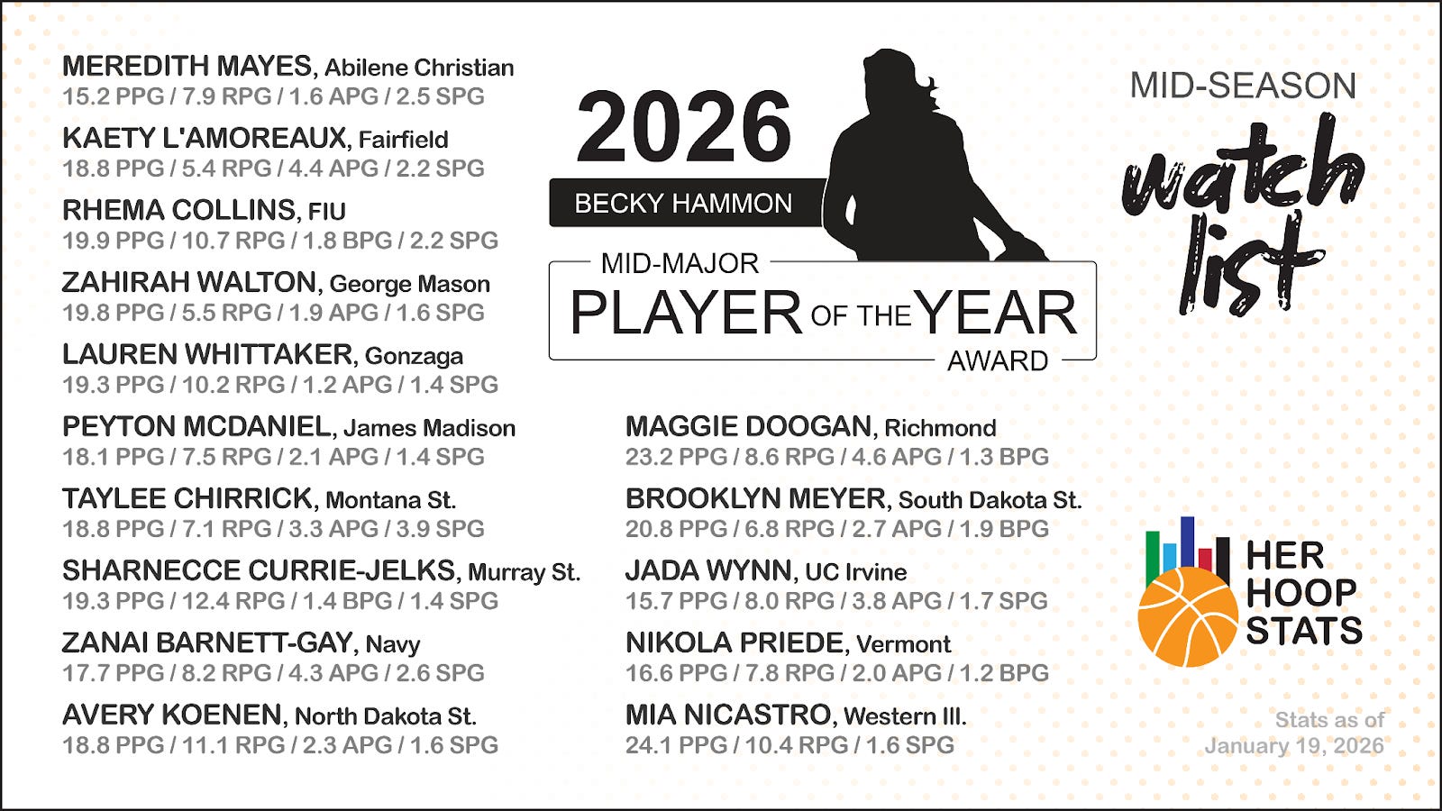 Hopewell, N.J. (January 21, 2026) — We are proud to announce the 15-player midseason watch list for the 2026 Becky Hammon Mid-Major Player of the Year Award presented by Her Hoop Stats. The Becky Hammon Award was first given out in 2020, and Harvard’s Harmoni Turner won the most recent award in 2025.
