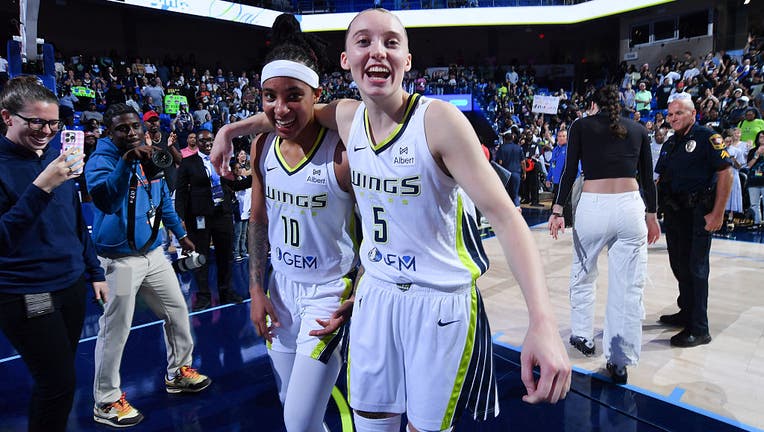 ARLINGTON, TX – JULY 3: Aziaha James #10 and Paige Bueckers #5 of the Dallas Wings celebrates during the game against the Phoenix Mercury on July 3, 2025 at the College Park Center in Arlington, TX. NOTE TO USER: User expressly acknowledges and agree