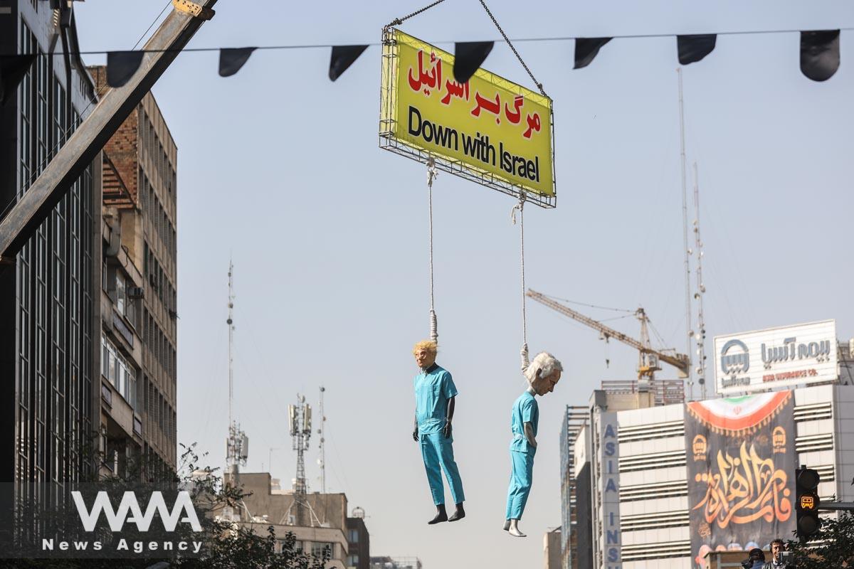 Models of U.S. President Donald Trump and Israeli Prime Minister Benjamin Netanyahu being hanged are displayed during the 46th anniversary of the U.S. expulsion from Iran, in Tehran, Iran, November 4, 2025. Majid Asgaripour/WANA (West Asia News Agency)