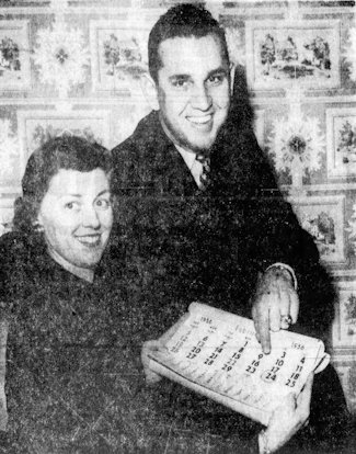 Newlyweds Ray and Joan Crone, with Ray pointing to the date he had to report to spring training. Source: Memphis Press-Scimitar, January 27, 1956.