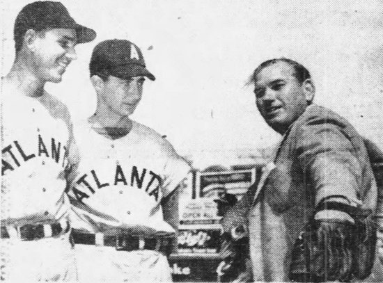 Crone, left, and Bill Currie, center, get some pitching tips from Dizzy Dean while they were trying out for the Atlanta Crackers. Source: The Atlanta Constitution, March 31, 1952.