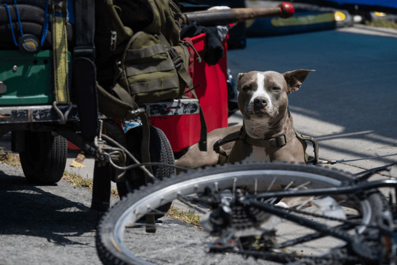 Dogs, bikes and belongings lay on the sidewalk after being hastily moved out of the targeted zone during a sweep of the homeless encampment near 8th and Harrison streets on June 4, 2025. More recently, health officials have said they detected an outbreak of leptospirosis in the camp. Credit: Adahlia Cole for Berkeleyside