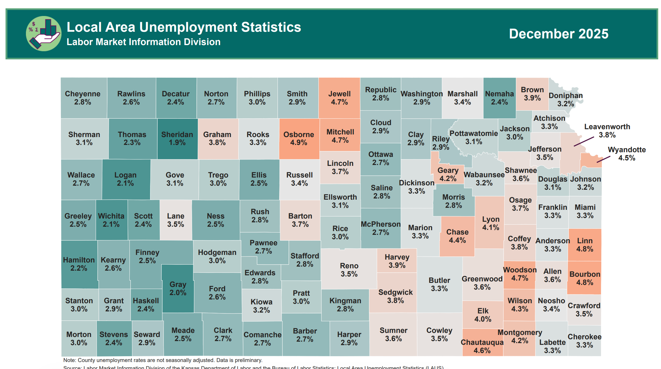 Preliminary estimates reported by the Labor Market Information (LMI) division of the Kansas Department of Labor (KDOL) and the Bureau of Labor Statistics (BLS) show a seasonally adjusted unemployment rate of 3.8% in December, according to a media release from KDOL.  This is unchanged from 3.8% in November and unchanged from 3.8% in December 2024. The labor force participation rate for Kansas increased to 67.5% in December.
