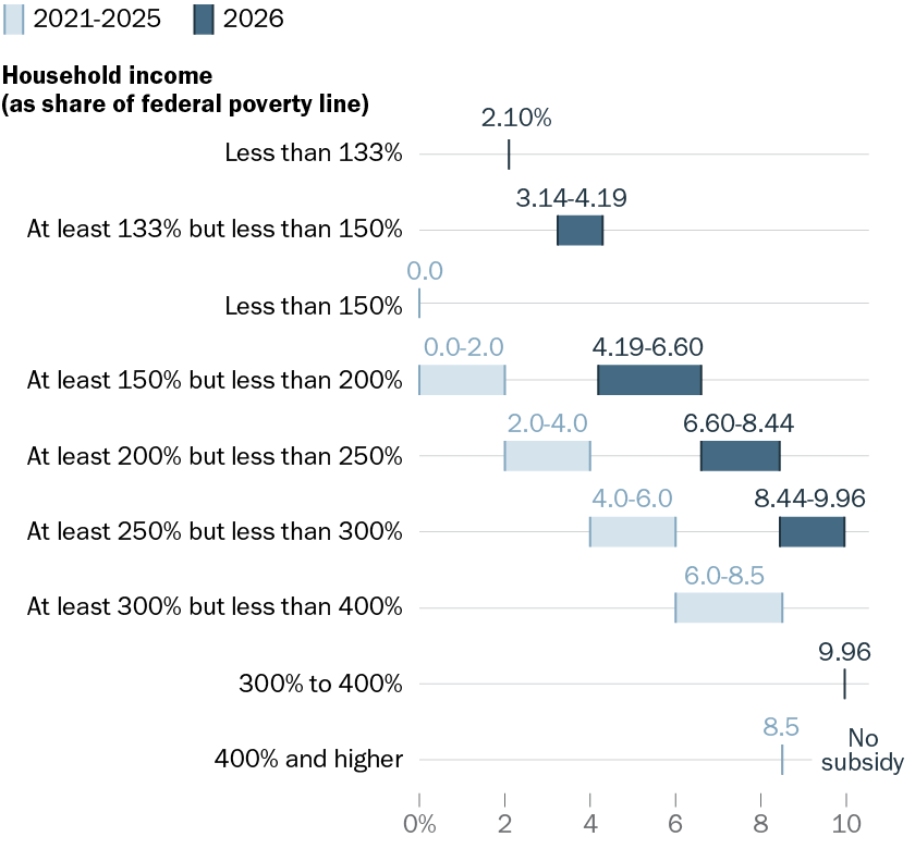 Household income (as share of federal poverty line)2021-252026Less than 133%2.10%At least 133% but less than 150%3.14%-4.19%Less than 150%0.00%At least 150% but less than 200%0.0%-2.0%4.19%-6.60%At least 200% but less than 250%2.0%-4.0%6.60%-8.44%At least 250% but less than 300%4.0%-6.0%8.44%-9.96%At least 300% but less than 400%6.0%-8.5%300% to 400%9.96%400% and higher8.5%No subsidy
