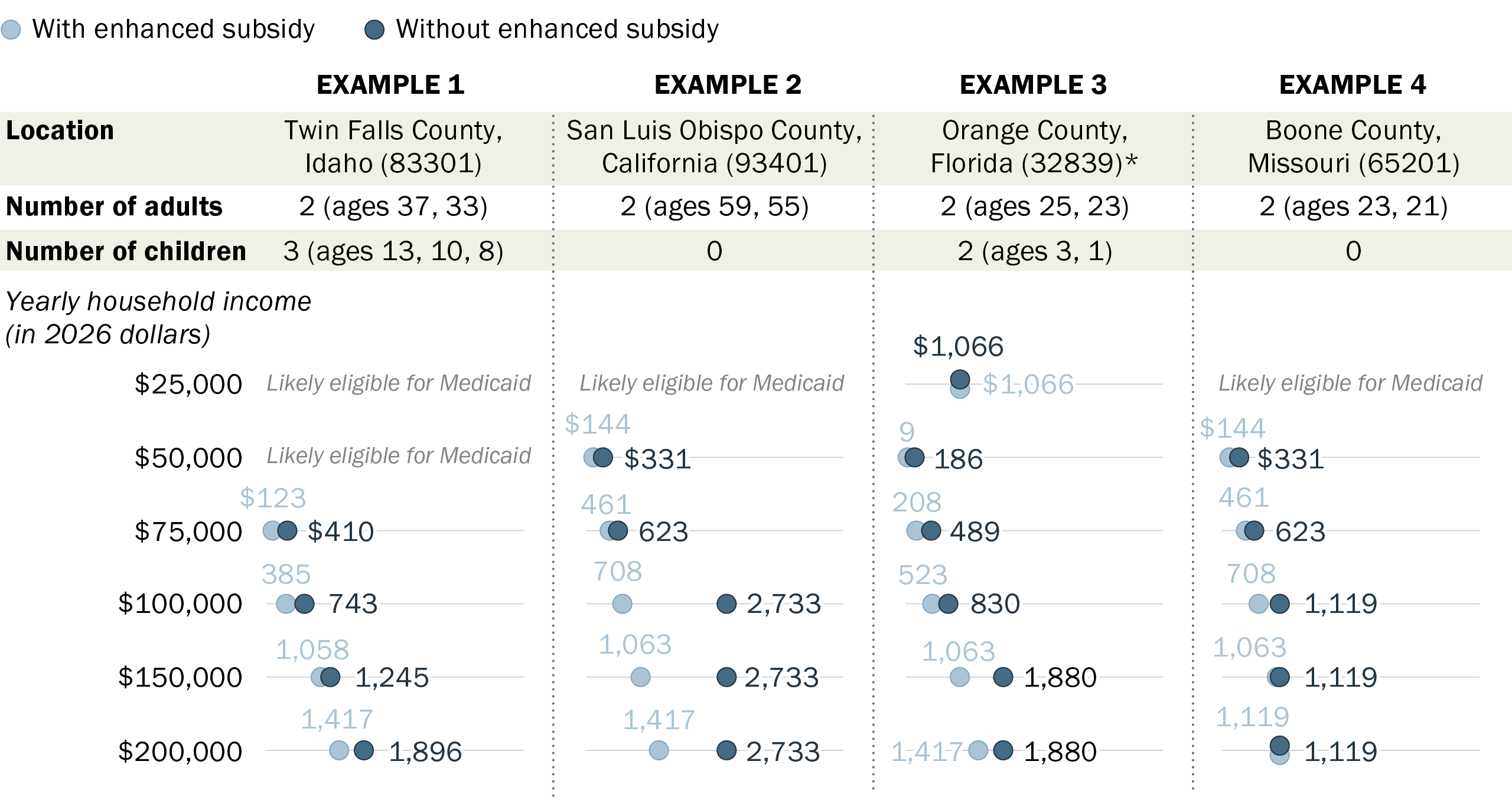 (in 2026 dollars)With enhanced premium tax creditWithout enhanced premium tax credit$25,000 Likely eligible for MedicaidLikely eligible for Medicaid$50,000 $144$331$75,000 $461$623$100,000 $708$1,119$150,000 $1,063$1,119$200,000 $1,119$1,119
