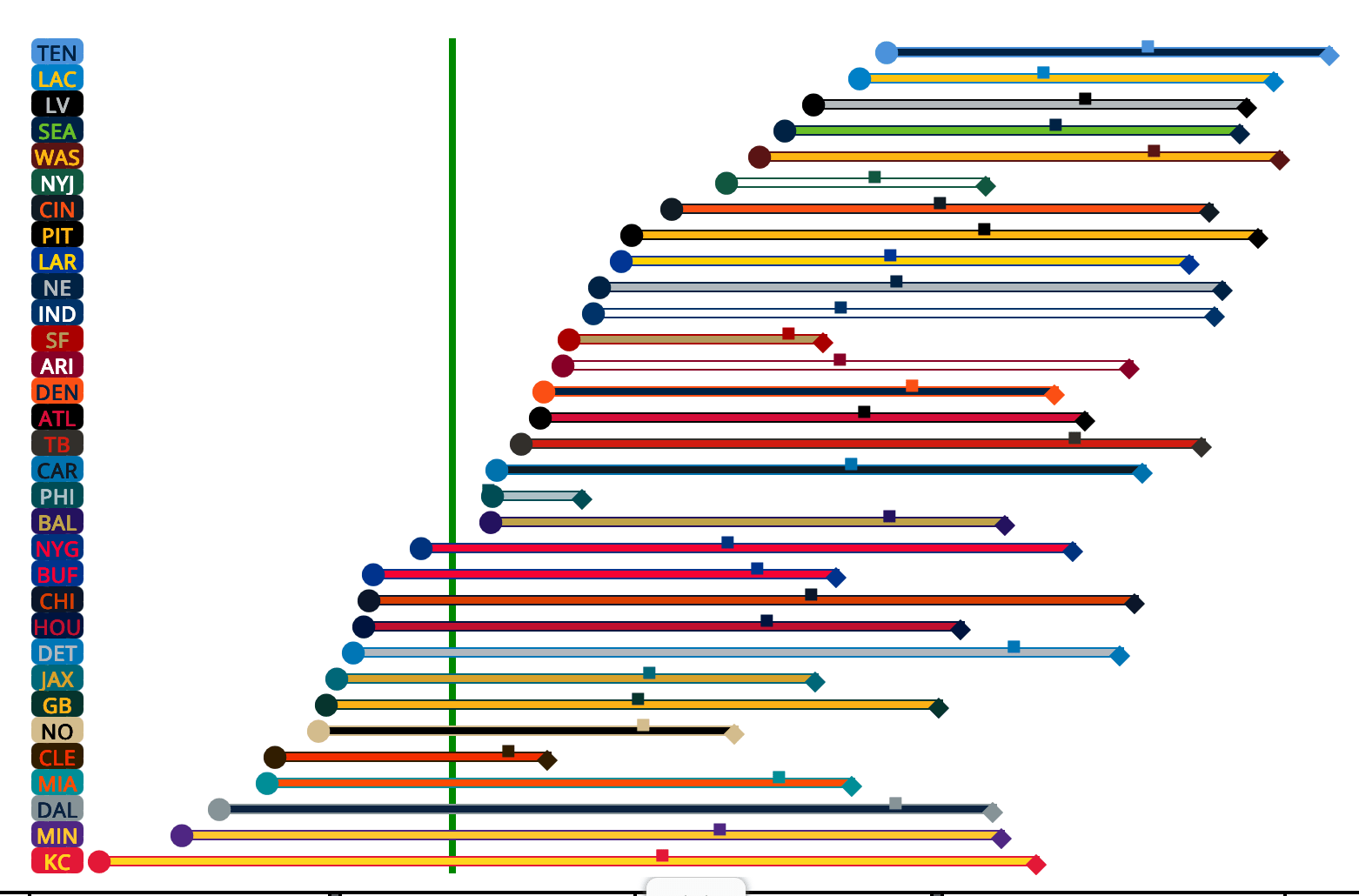 The farther to the right you are on this chart relative to the vertical green line (zero effective cap space), the better. The left edge for each team is their current effective cap space. The squares and diamonds represent where each team could potentially wind up with “simple” or “maximum” contract restructures.