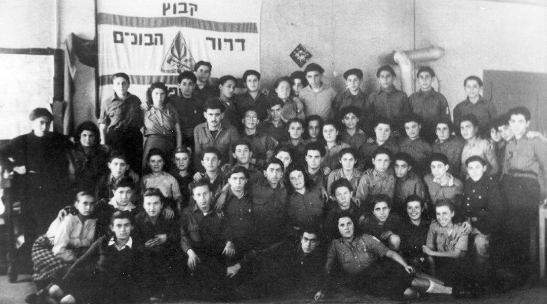 Members of the Dror Habonim youth movement in the Indersdorf displaced person’s camp, Nov. 29, 1946. Habonim and Dror, separate movements before their merger in the early 1980s, were closely associated with Zionist activism in Europe and the subsequent building of kibbutzim in Israel. (Ghetto Fighters Museum Archive)
