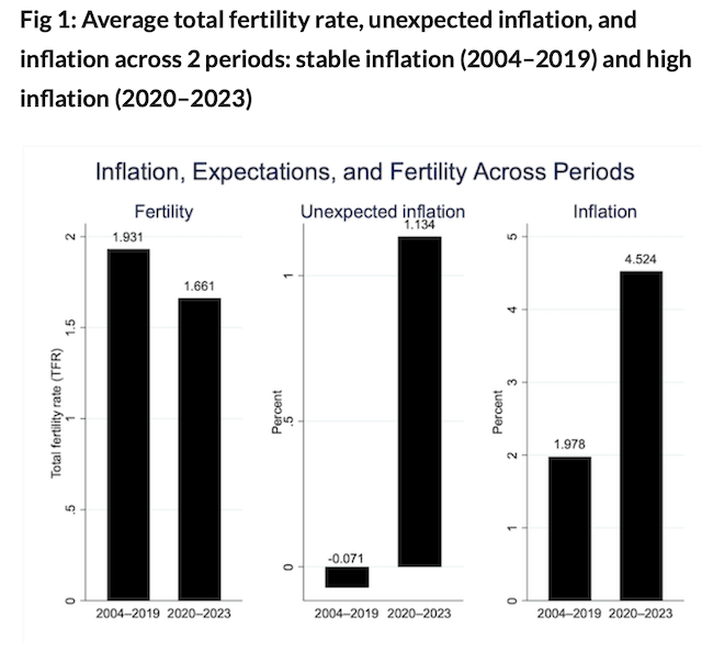 Does inflation reduce fertility? Fertility decisions tend to be forward-looking, shaped not only by current economic conditions but also by households’ expectations about future income, prices, and economic stability. Previous research even refers to fertility as a “leading economic indicator,” since conceptions tend to decline several quarters before actual economic decline registers in the data.  This might be more surprising to researchers than anyone who is currently in the midst of growing their family—of course one takes future economic conditions seriously when discussing future children with their spouse.