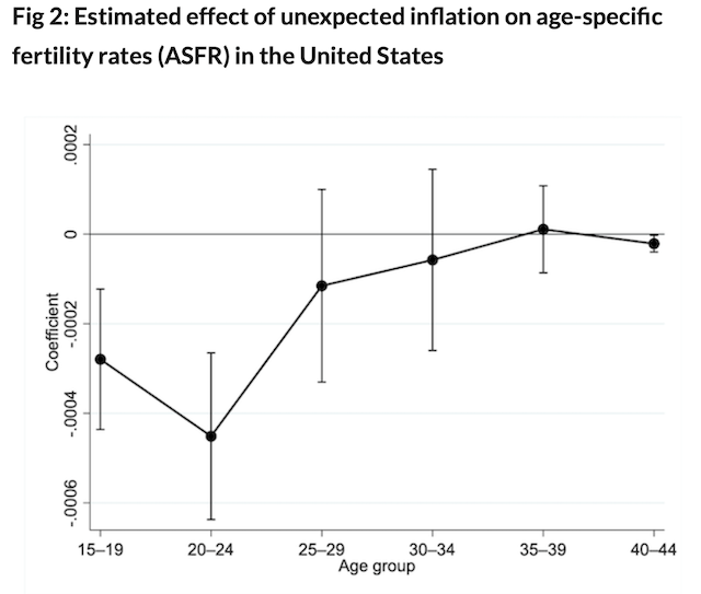 Our paper further examines the effect of unexpected inflation on age-specific fertility rates (ASFRs). Younger women often have more scope and flexibility to postpone childbearing, especially when economic conditions appear unfavorable. Older women, by contrast, have less flexibility, so their fertility responses tend to be smaller and reflect changes in completed family size rather than timing.