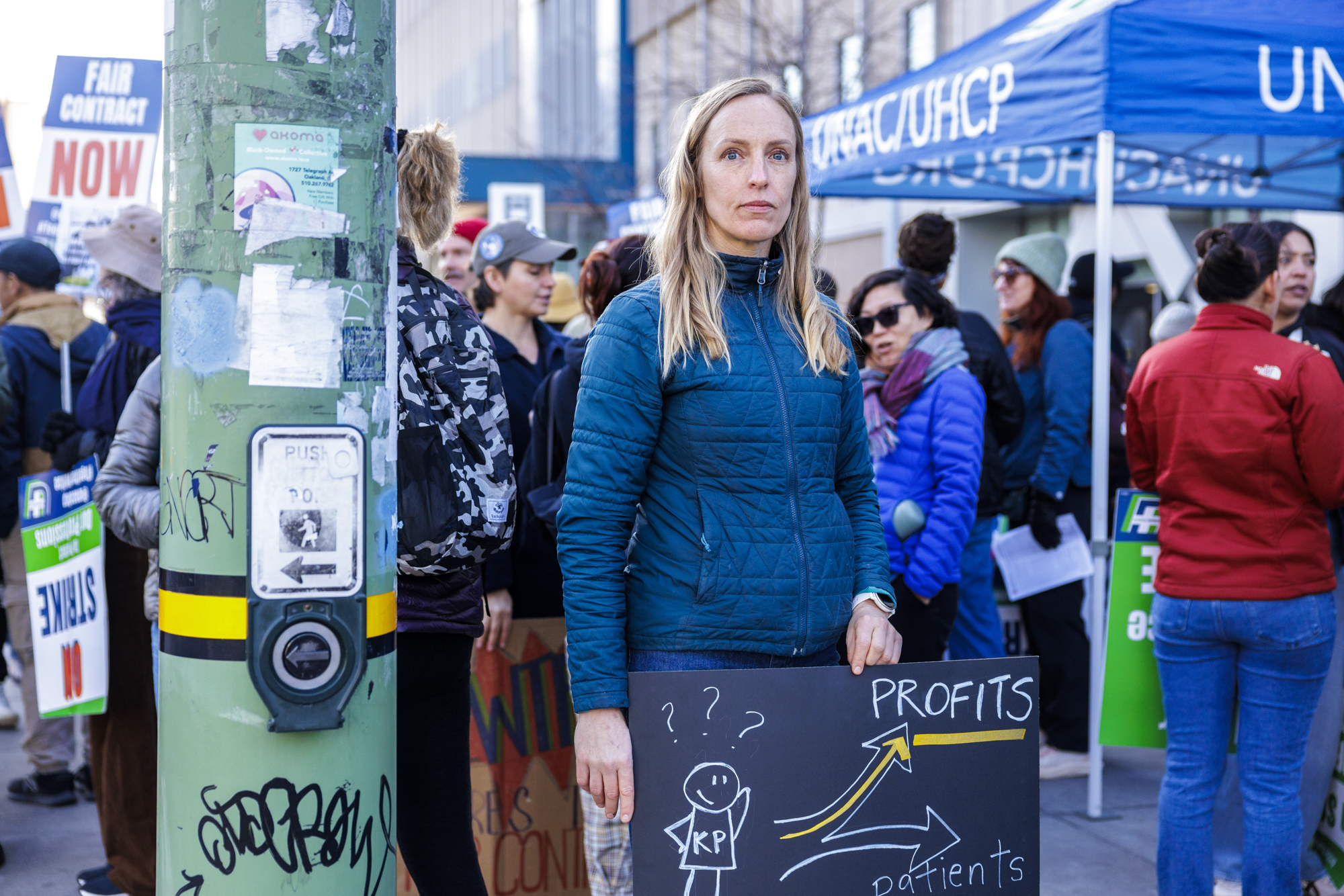 Sanne Jacobsen attends the strike at Kaiser Oakland Medical Center in Oakland on Jan. 26, 2026. (Martin do Nascimento/KQED)