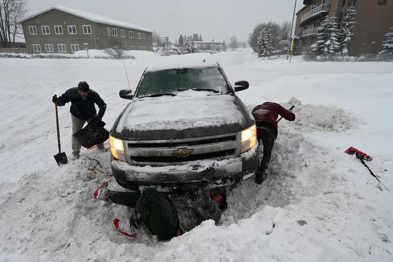 Motorists dig-out a high-centered pickup truck at East 13th Avenue and A Street during the snowstorm on Tuesday, Jan. 27, 2026. (Bill Roth / ADN)