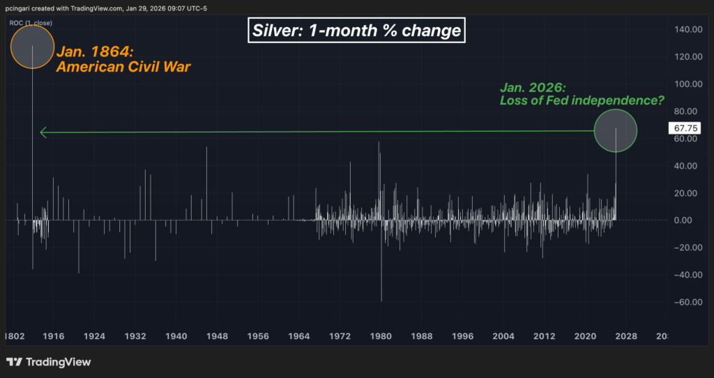 According to long-term silver price data, the metal has not recorded a monthly advance of this magnitude since January 1864, at the height of the Civil War.