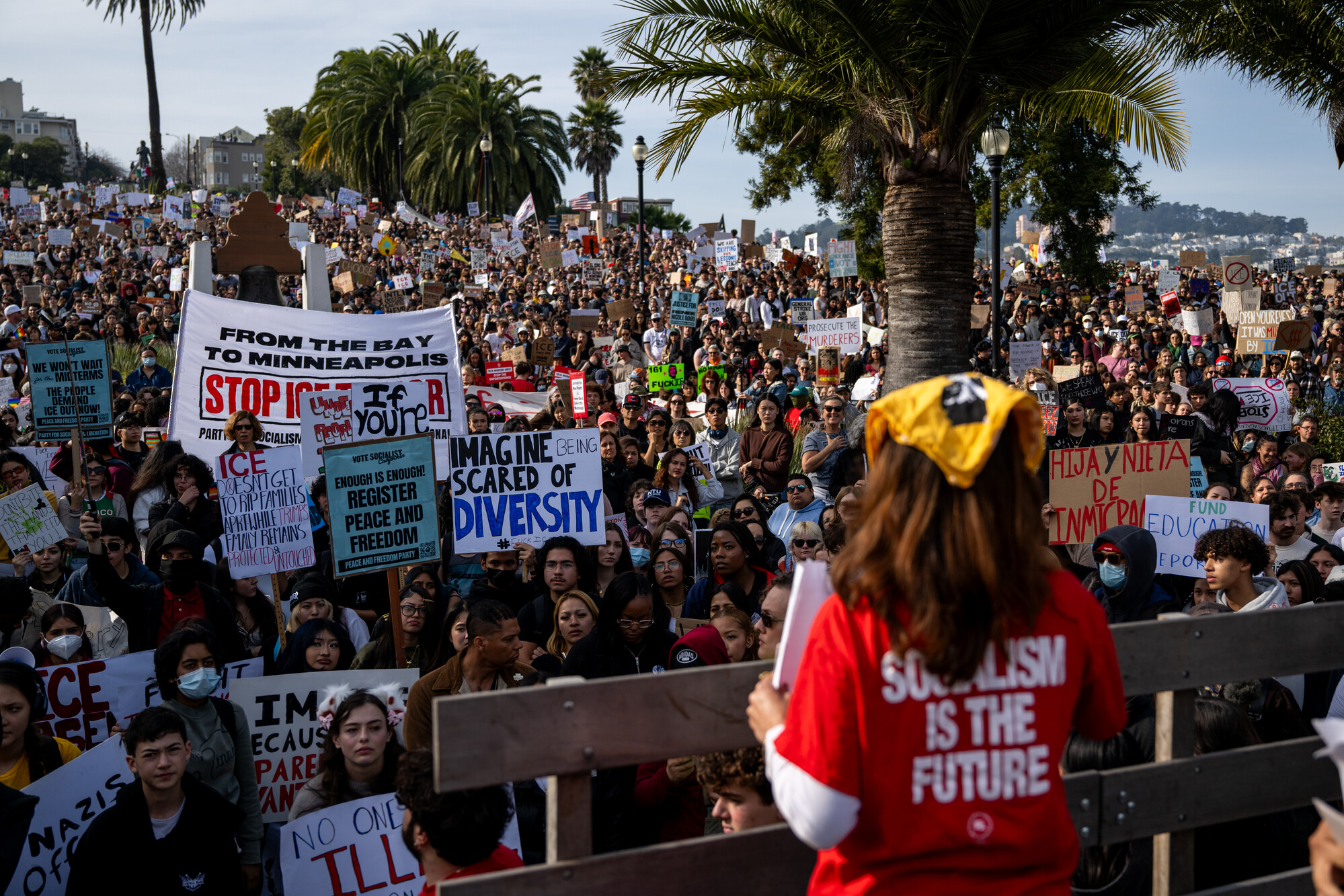 Demonstrators fill Dolores Park in San Francisco on Jan. 30, 2026, during a nationwide day of action to protest immigration enforcement operations. (Beth LaBerge/KQED)