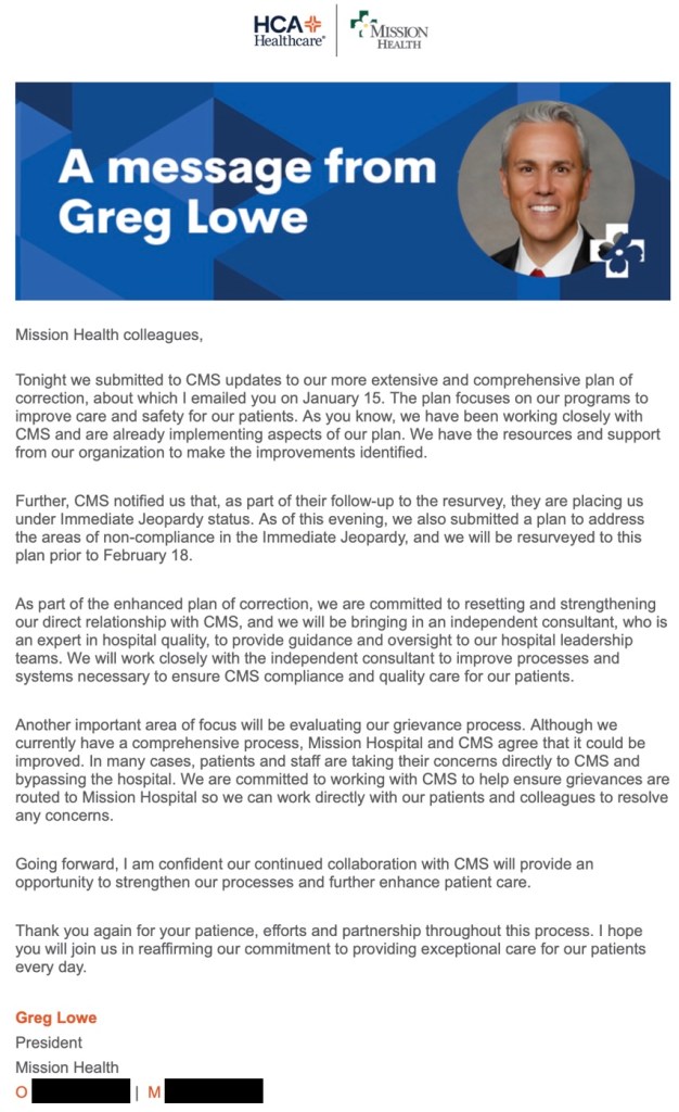 Greg Lowe, president of HCA-owned Mission Health, sent this email letter to employees Thursday evening, announcing that the health system’s flagship hospital, Mission, has again been placed in “immediate jeopardy” by the federal Centers for Medicare and Medicaid Services for practices that endanger patients. It is the third immediate jeopardy citation for Mission in the past two years. // Phone numbers redacted by Asheville Watchdog