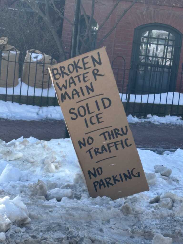 “spotted on wallach place nw- broken water main and non response yet from Dc emergency water 🤪. cars are frozen in the water that is rapidly freezing.”
