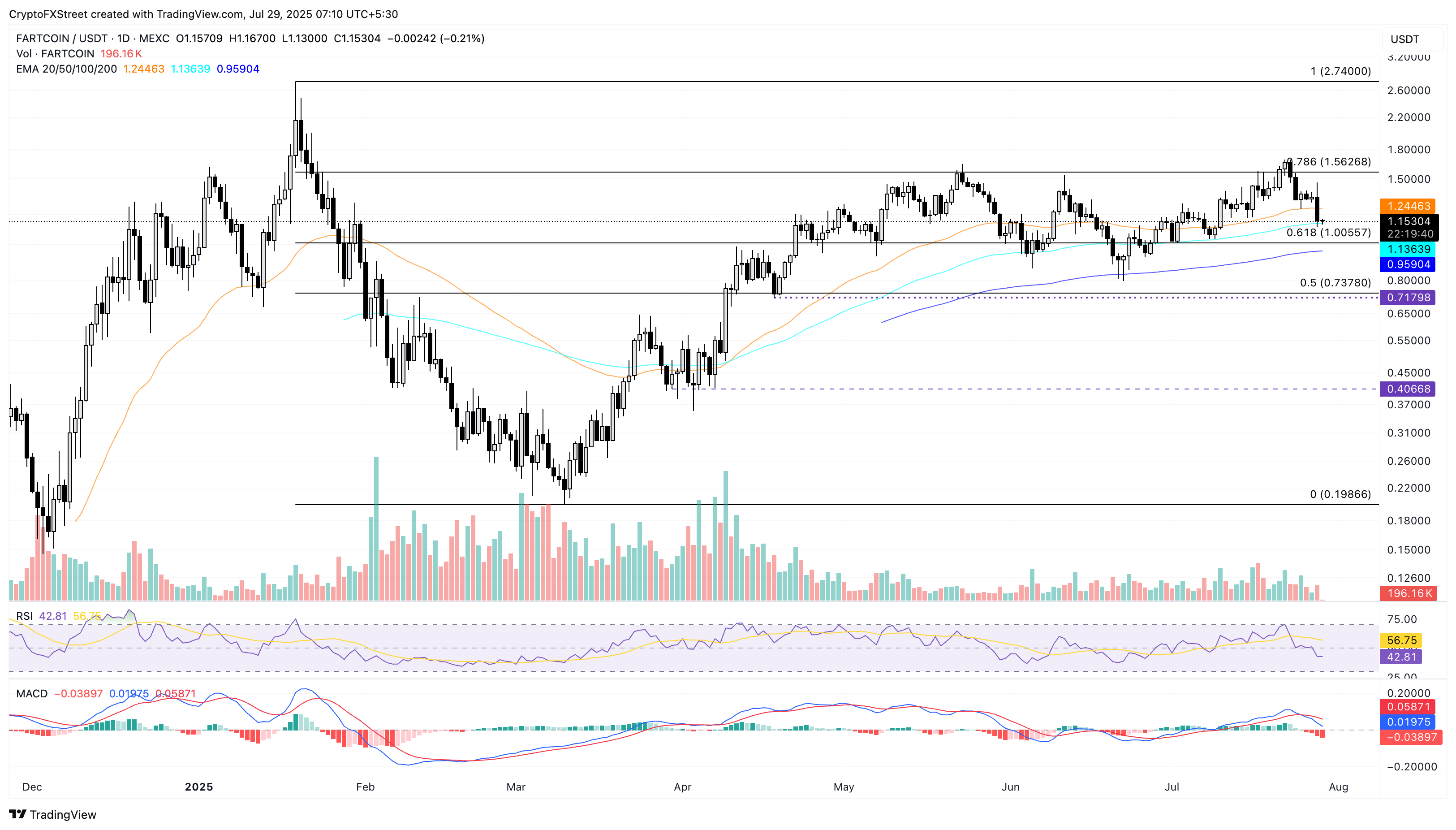 Fartcoin (FARTCOIN) edges lower after a nearly 14% drop on Monday, outpacing the broader market pullback in the last 24 hours. The meme coin holds above the 100-day Exponential Moving Average (EMA) as the rising bearish momentum risks a potential retest of the $1 psychological level.