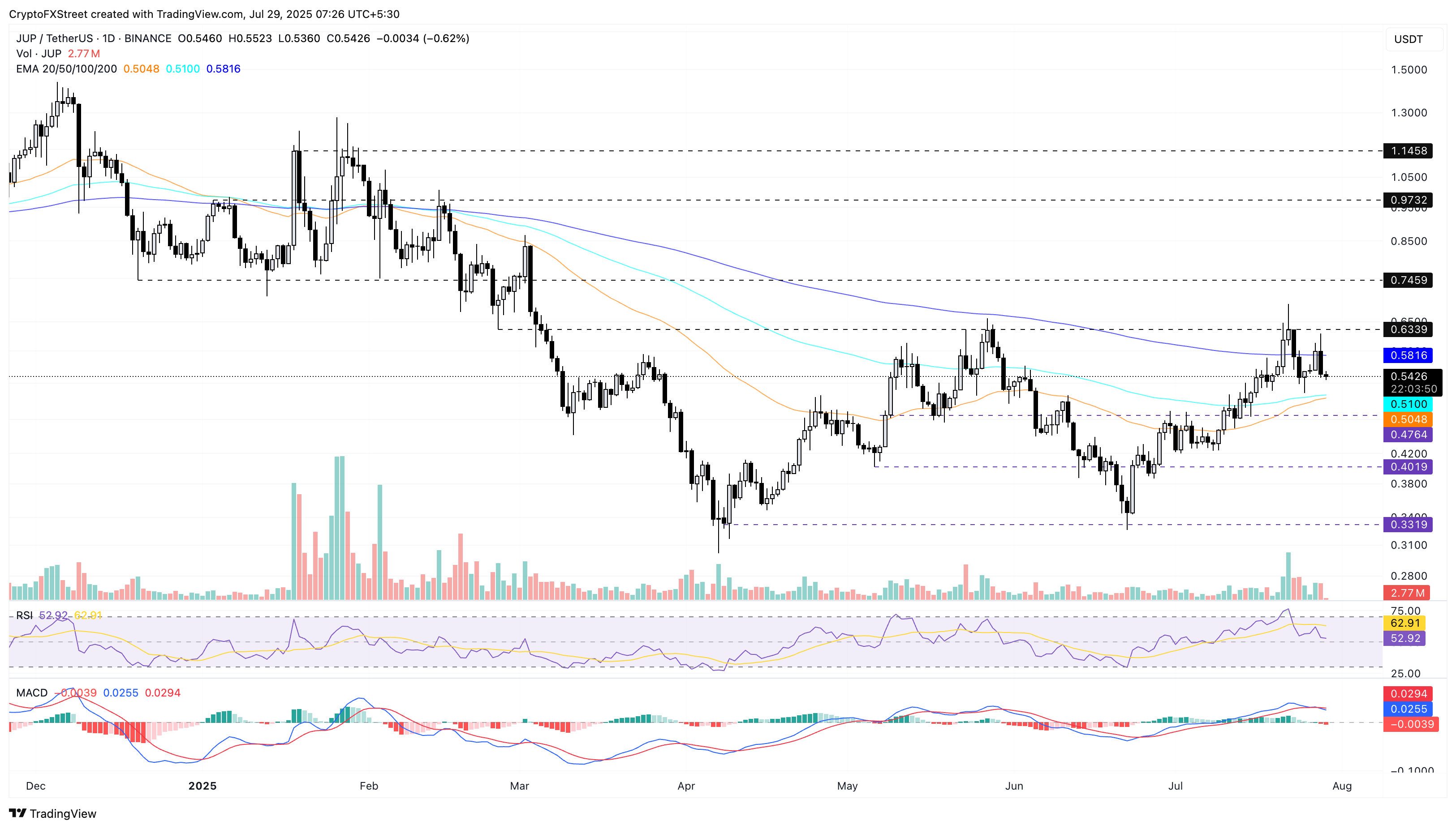 To reinforce an uptrend, JUP must reclaim the 200-day EMA and surpass the $0.6339 resistance level.