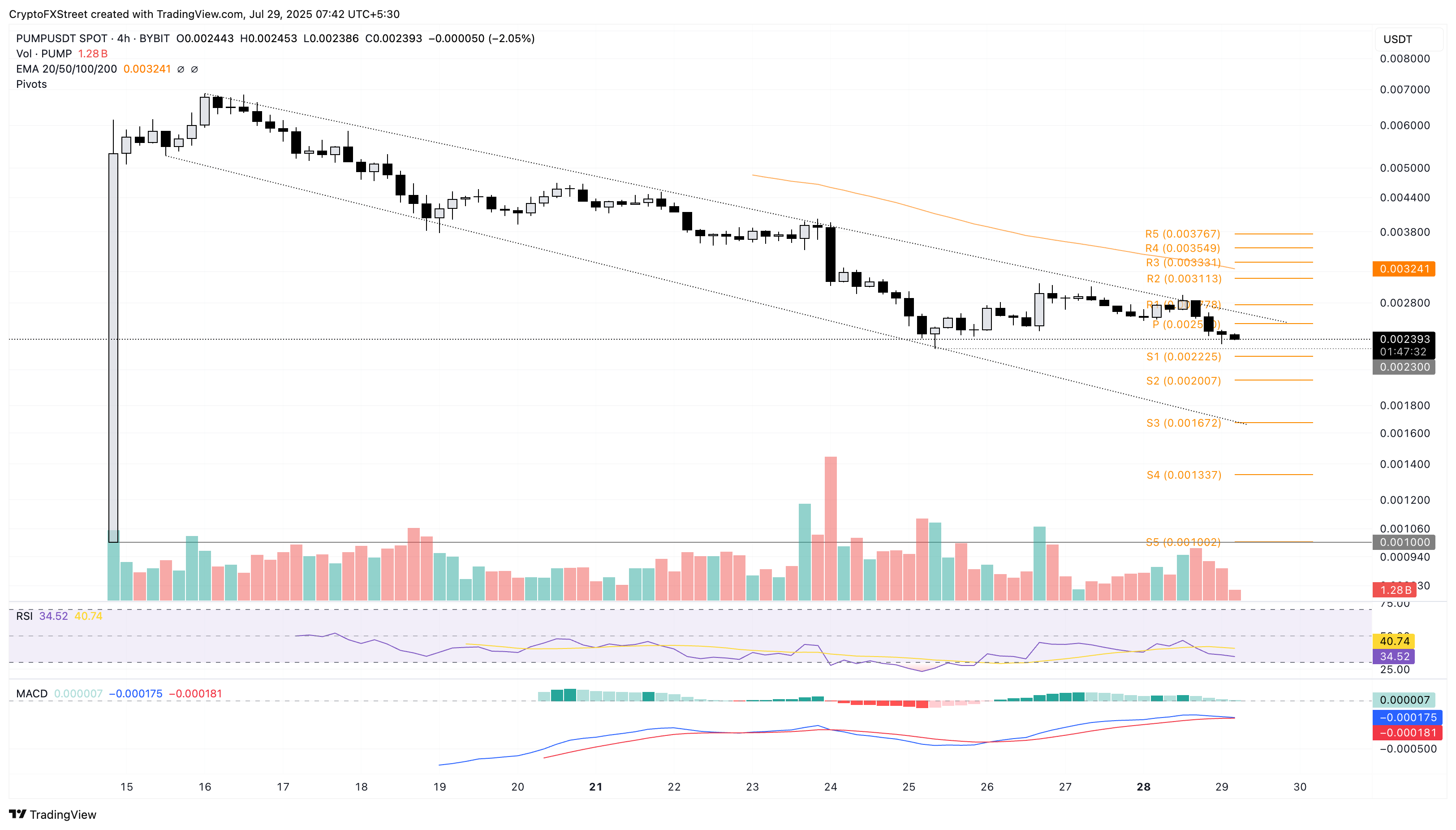 PUMP approaches the $0.002300 level marked on Friday, as selling pressure grows, indicated by the RSI at 34, which is approaching the oversold boundary on the 4-hour chart.