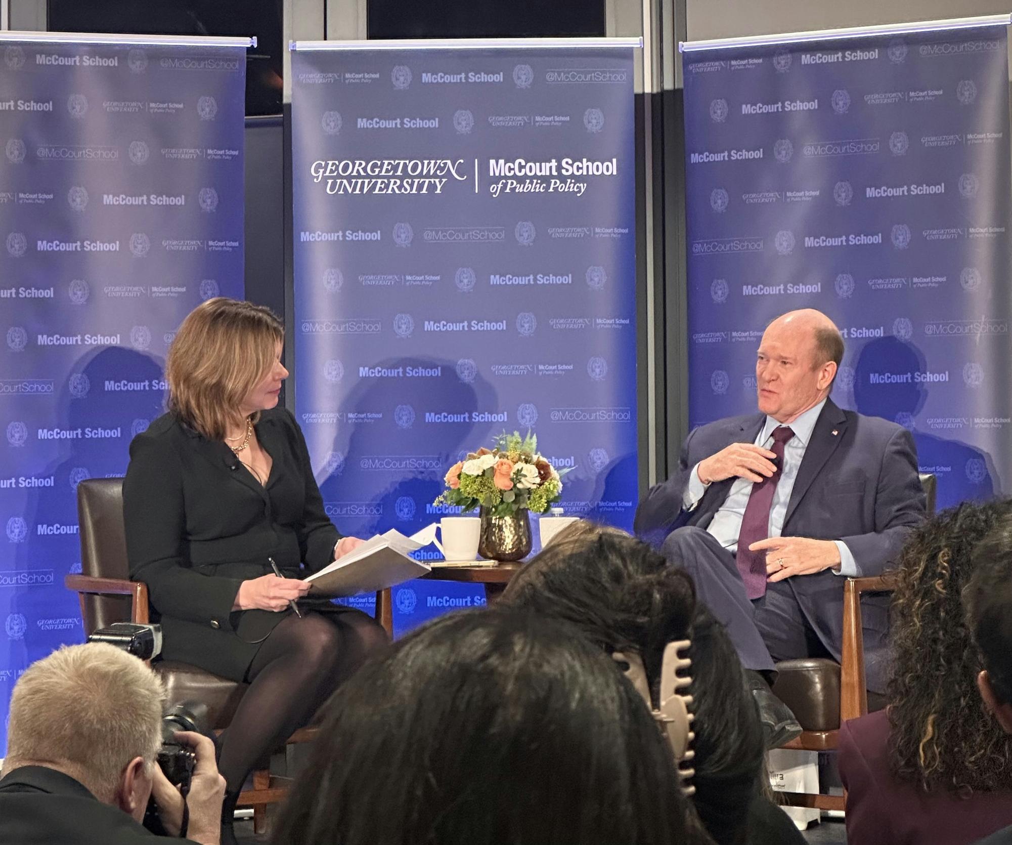Coons warned that, although authoritative use of law enforcement may temporarily deliver security, long-term opportunity and citizens’ safety comes from a governing system that implements justice throughout its institutions. The event, Georgetown’s annual Whittington Lecture, was hosted by the McCourt School of Public Policy.