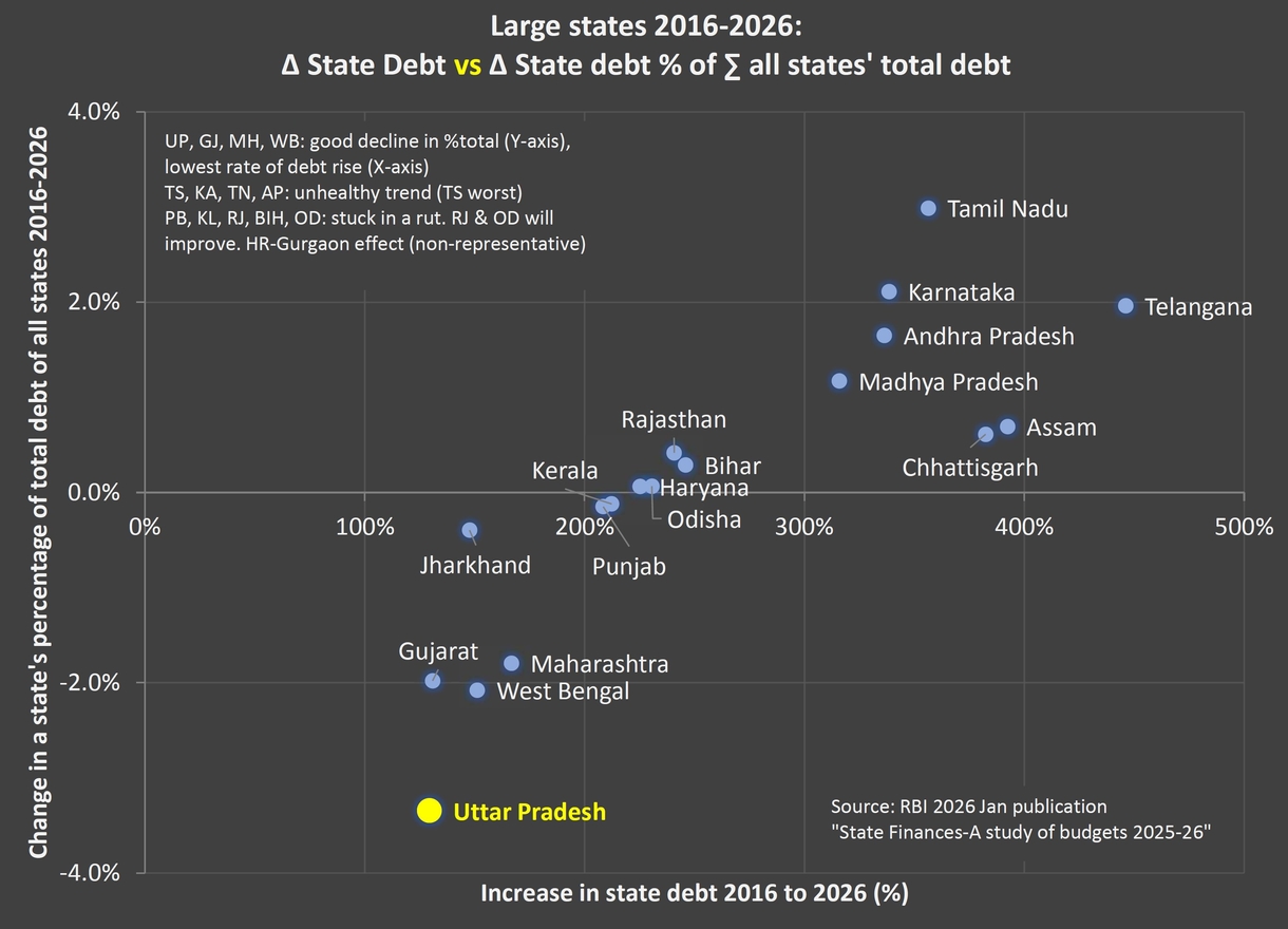 The first step was to study a state’s major indicator of economic robustness or gloom: its debt. For this, the increase in a state’s debt, or outstanding liabilities, in the period 2016-2026 was plotted against the change in its proportion to the total debt of all large states combined. To utter surprise, and as a chart below shows, UP stood out all on its own in a positive way. Its position is marked in yellow.