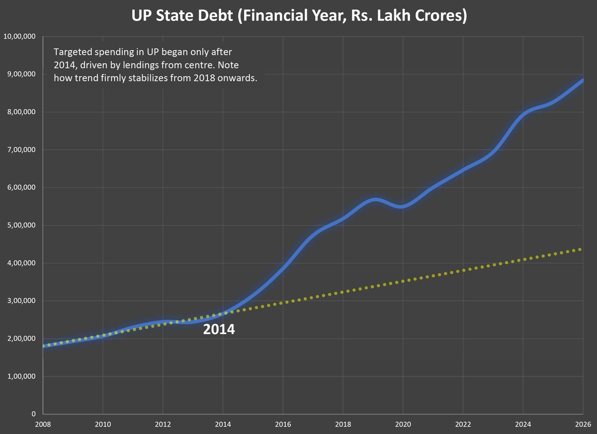 To understand this in absolute terms, UP’s debt for almost two decades, from 2008 to 2026, was plotted in linear fashion. A curious trend emerged.