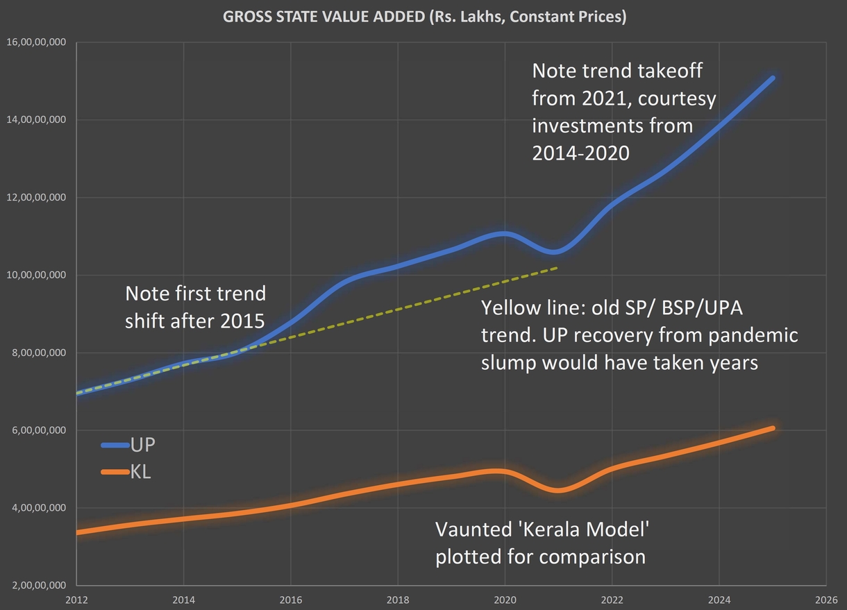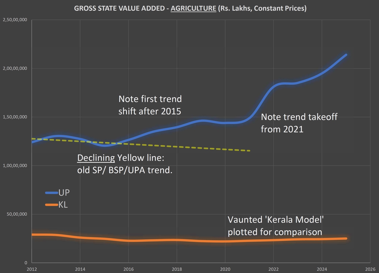 Between 2012 and 2014, GVA from agriculture was on a mildly declining trend, as the dashed yellow line above indicates. But from that point on, the trend began to reverse and rise, first slowly and steadily until the pandemic hiccup, and then, a takeoff which is still ongoing. People mocked Mr Modi during the initial years of his tenure when he announced ‘packages’ to UP; they called it a political stunt. But now, after a decade, the results speak for themselves.