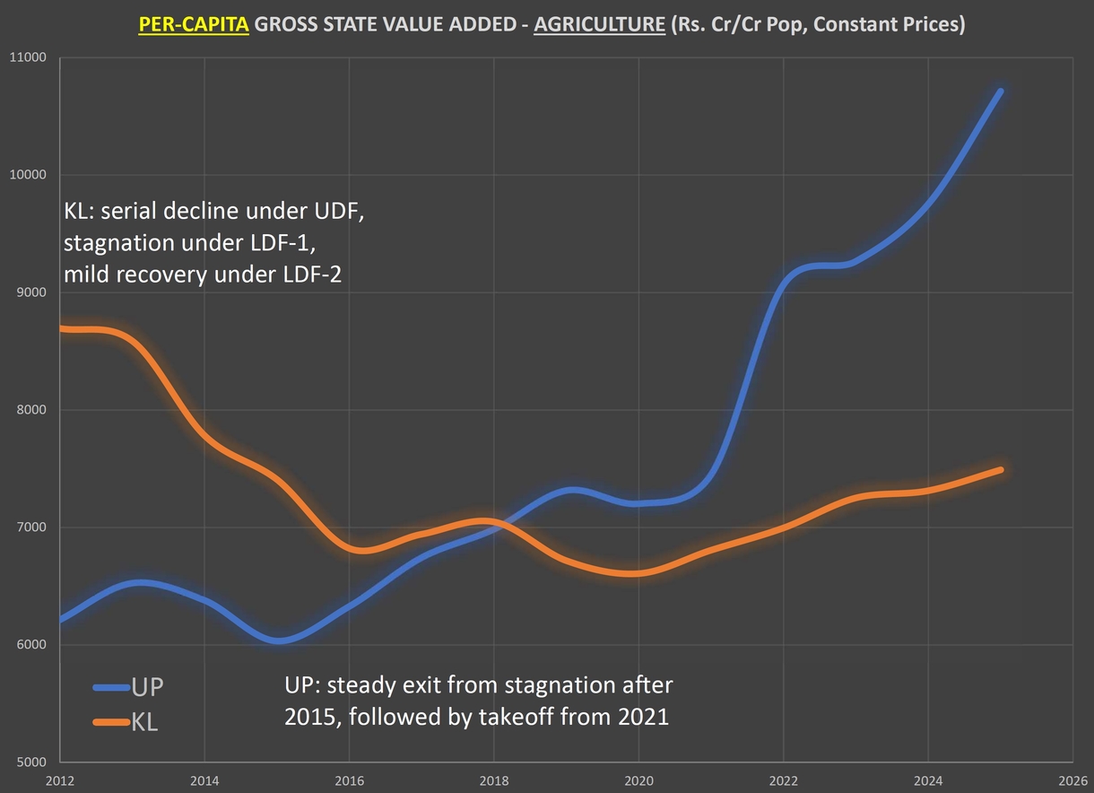 Is that true? No, because value addition is value addition irrespective of conditions. Still, just to dispel misleading and factually incorrect arguments, the same agriculture GVA data for both states was plotted on a per capita basis. The results, though, give an even more encouraging picture of progress in UP, and, as a chart below shows, an even more bleak picture of the abysmal state of agriculture in Kerala.