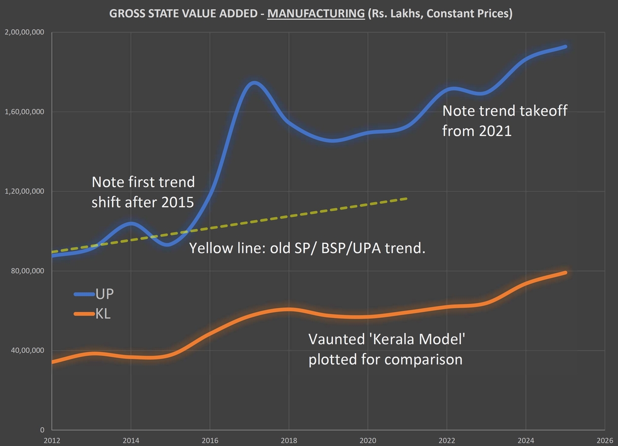 Note how the blue line declined serially from 2013 to 2015, bottomed out as soon as the initial policies started being implemented by the central government, and then took off on a steep new rising trend as soon as the worst of the pandemic was over. It is as if UP was just waiting to be primed in the right way, with the right, sustained diligence.