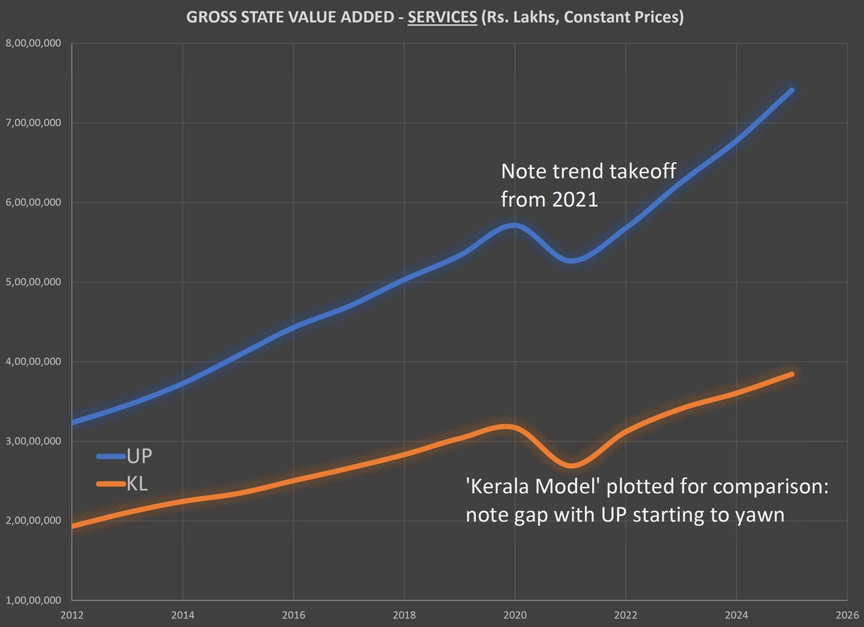 The abject state of the services sector in UP prior to 2014 can be seen from the fact that whilst its population is six times larger than Kerala, its services GVA in 2012 was only around 50 per cent larger. Nonetheless, in the ensuing 12 years, service sector GVA in UP has adopted a steep, sustained, rising trend, with the gap between it and Kerala starting to yawn.