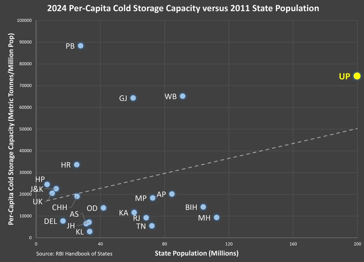 In absolute terms, today, UP is second only to Punjab in cold storage capacity. In per capita terms, as a chart below shows, it is in a league of its own and set to go past Punjab in a few years. Any state below the grey, dashed average line can do better.