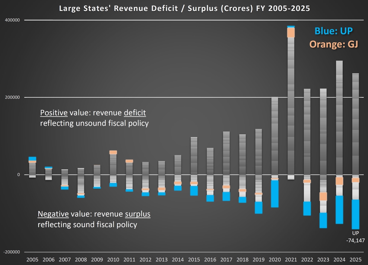 This is top flight development planning and economics. No other state comes close to this level of fiscal prudence allied with targeted spending, not even Gujarat, which has the next best record for strictly maintaining a revenue surplus plus capital expenditure. Look at the chart below. UP’s revenue surplus is marked in blue, and Gujarat’s in orange.