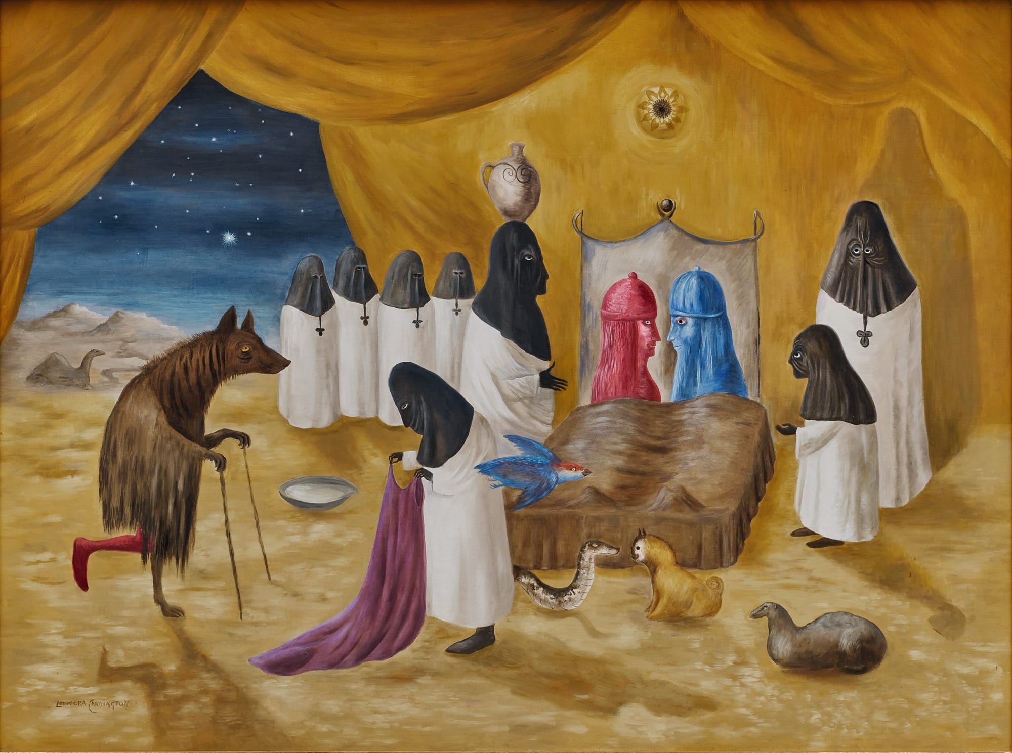 Multiple-headed deities, strange woodland feasts, plants with sprite-like faces, and worlds floating on animals’ backs are just a few of the dreamlike occurrences in the work of Leonora Carrington (1917-2011). The British-Mexican artist, born into an upper-class family in Lancashire, was fascinated by the notion of “other.” She immersed herself in fairytales and folk stories by the likes of Beatrix Potter and Lewis Carroll and rebelled against the strict expectations of high-society women in England.
