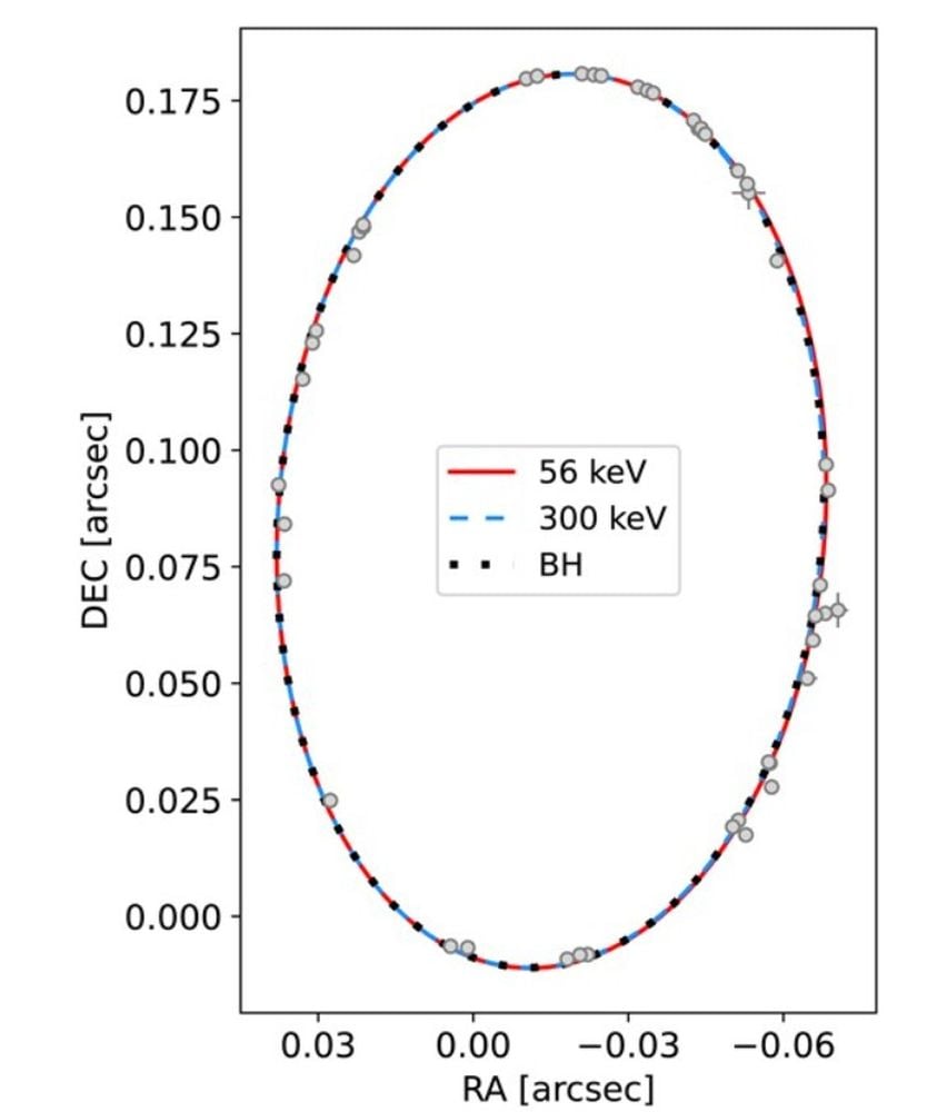 *This figure shows the orbit of the S2 star. There’s very little difference between the star’s observed orbit (BH, black) and the two modelled orbits from the two types of dark fermions. Image Credit: Crespi et al. 2026. MNRAS*