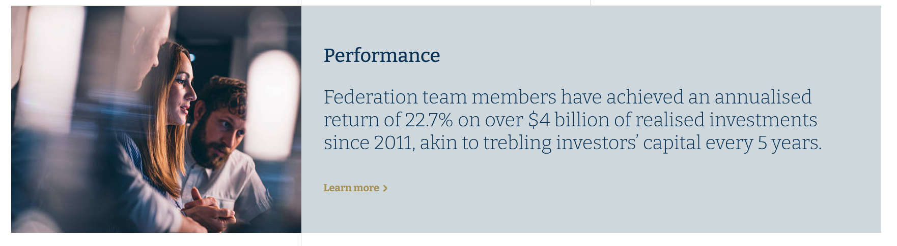 Federation trumpets that its “team members have achieved an annualised return of 22.7 per cent on over $4 billion of realised investments since 2011, akin to trebling investors’ capital every five years”.