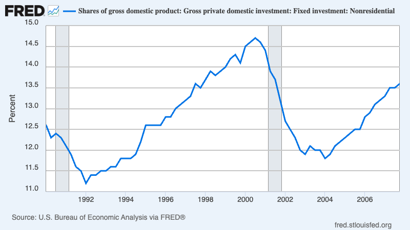 Why? Accelerated productivity growth would indeed reduce the inflation rate, other things equal. This might allow policymakers to run an economy with low unemployment and tight labor markets, as Alan Greenspan did in the late 1990s. But while it’s possible for new technologies to reduce inflation by reducing production costs, they also raise prices by driving higher investment spending by business, which can lead both to shortages of particular goods like memory chips and overheating in the economy as a whole. The 90s technology boom led to a very large rise in business capital expenditure — mostly carried out by telecoms, not dotcoms — as a share of GDP: