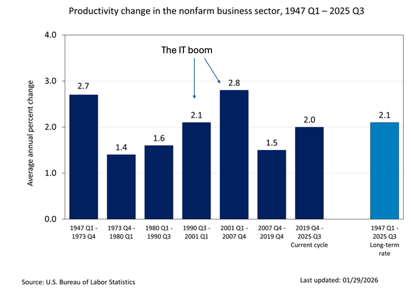 As for promises of a productivity bonanza, it’s instructive to look at the history of productivity as measured by the Bureau of Labor Statistics, which calculates growth rates between business cycle peaks: